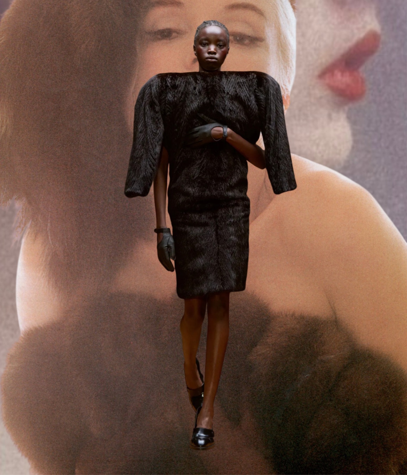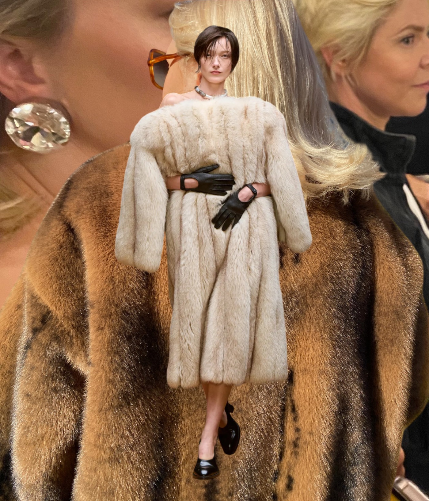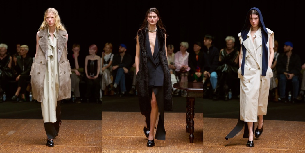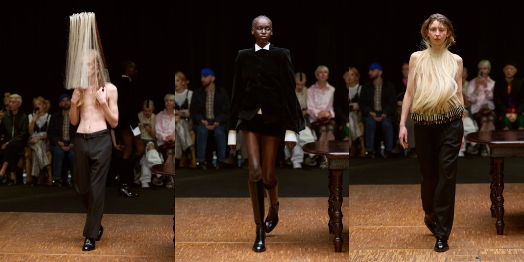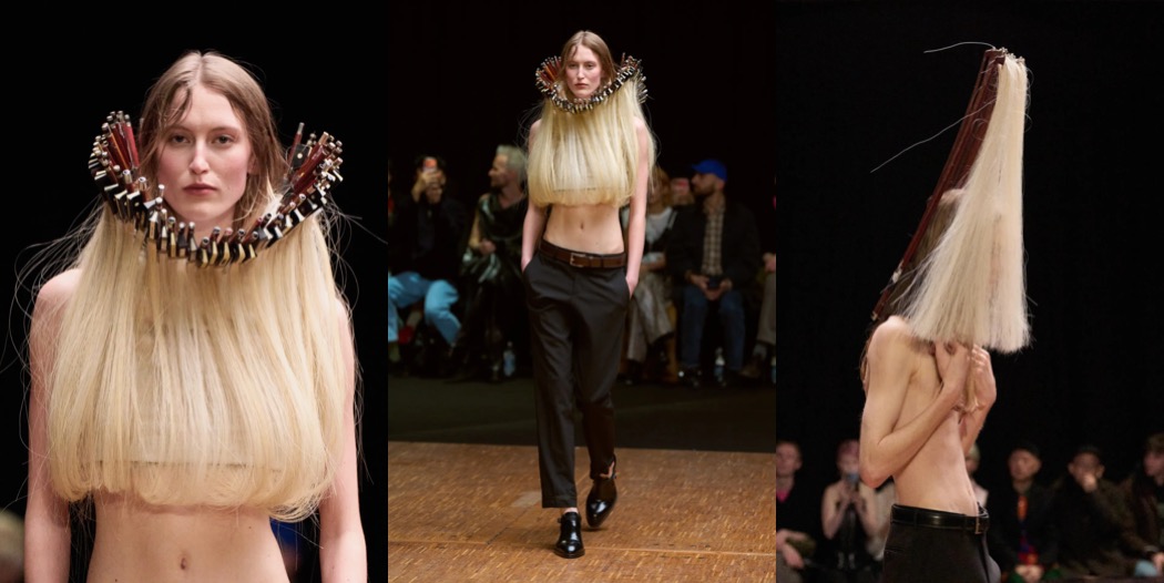 But the distortions and subtle provocations did not end there. Mirrors appeared as accessories – an ode to vanity, but also to introspection. Silken strands that snaked up the body and fastened at the neck (where zippers might once have been) were not samples of blonde hair, but horsehair violin strings. She imagined a musician impeccably dressed for a performance, only to lose herself entirely in the music. And the fur coats that seemed to levitate, hovering like oneiric corpses above the models’ bodies? A literal “home for the body”, staged in a manner reminiscent of an Olivier Saillard and Tilda Swinton performance.