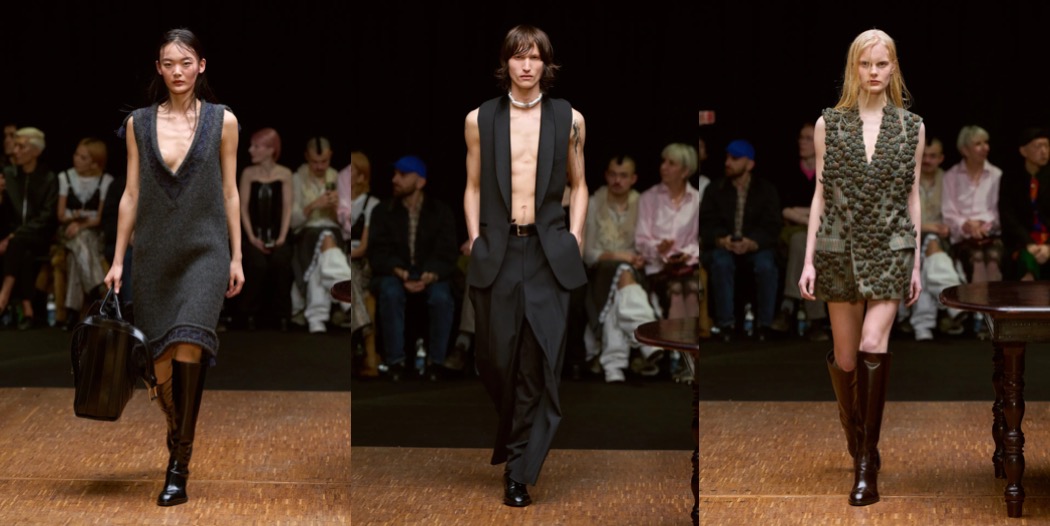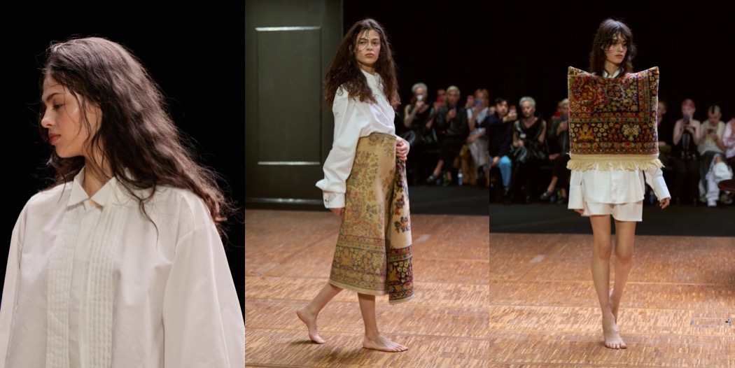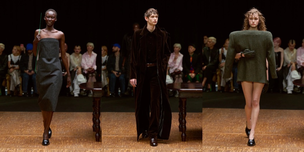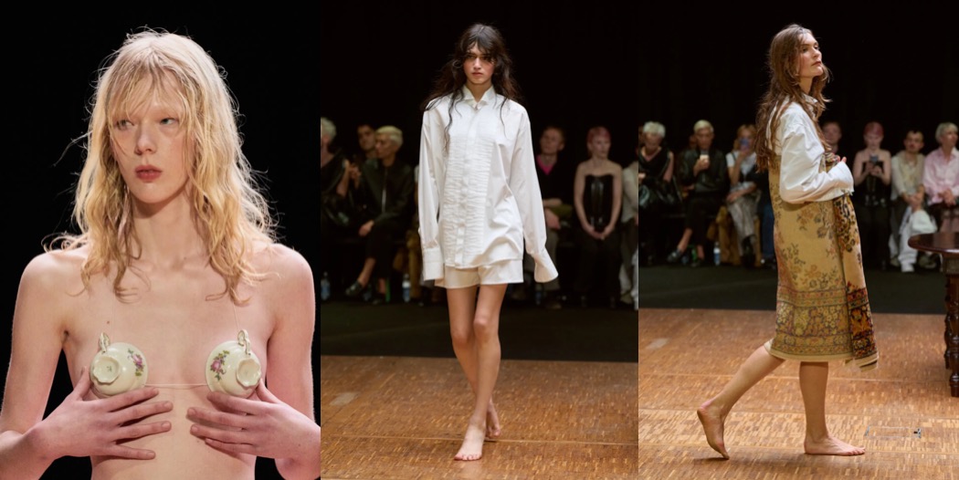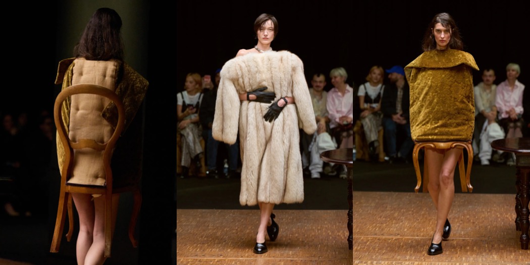 For autumn–winter 2026, Hodakova returned to the idea of home – a theme she has explored for some time, but which here felt more substantial and powerful than ever. True to her practice, she transformed everyday objects into garments: an itty-bitty bra fashioned from teacups; a rug crafted into a capelet; pieces incorporating parts of chairs. The effect was as subversive as when Meret Oppenheim covered a teacup in fur: feminine decorum gone rogue, yet also wildly sensual.