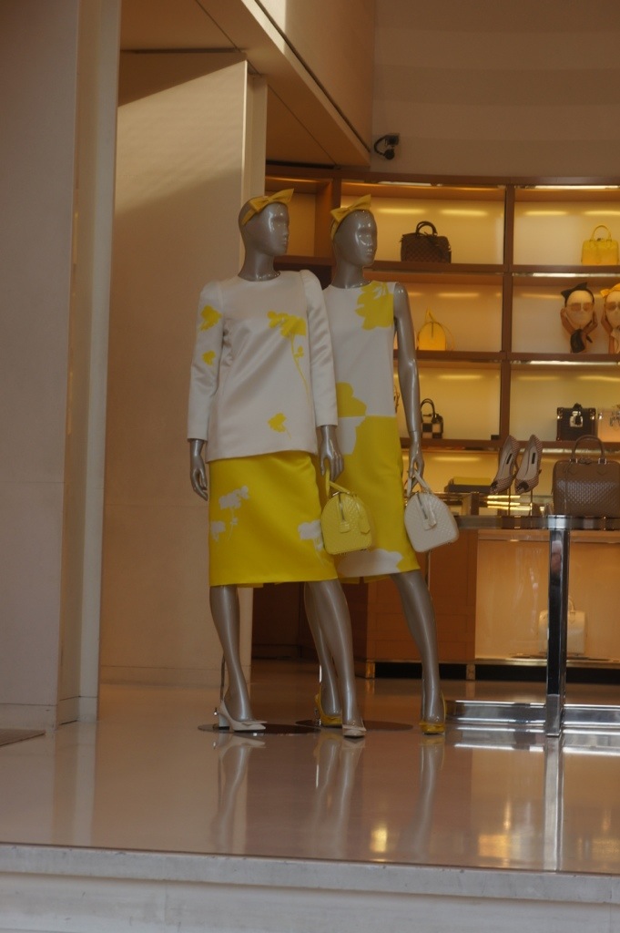 The square power! The welcome sign that it’s all LV, were the squares on windows! Inside the first thing I see are the beautiful dresses full of yellow squares. The shoes with a pointy nose are very 60’s and at the same time modern. They were in two types- with md heel and a high heel- but I liked more the mid one.