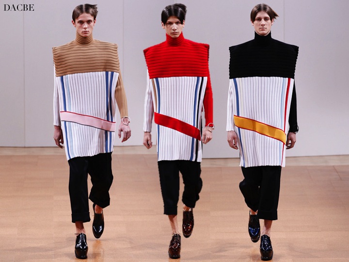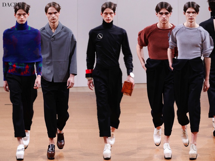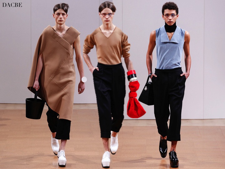 Is it the upcoming future for men? Will we, men, wear boxy clutches, colourful bracelet, kimono/dresses and shoes on high platforms? J.W. Anderson tells us the strange future in his recent collection. What I admire about him, is that he really creates something new, something fresh- and no body will tell him STOP. Known for androgynous fashion, Anderson did a very unisex collection- well, it could be worn also by women. While looking at it, it looks a bit out of world… but who knows. Maybe the world will be such a strange place, that men will wear these outfits? For now… don’t think so.