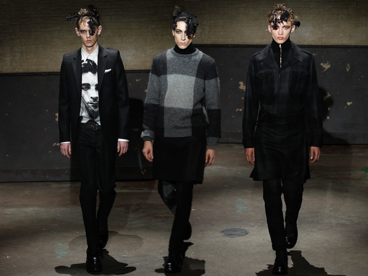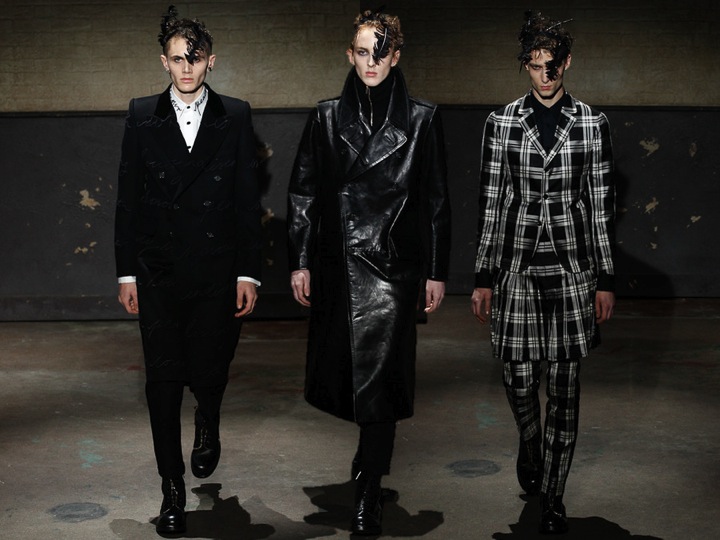 Trust Sarah Burton to choose the most haunting and beautifully strange show setting of LCM. In the austere rooms of Soho’s Welsh Presbyterian Chapel, Alexander McQueen men’s show went on. With the super dull faces of the models, the black & white show full of coats, sweaters and serious blazers took it’s place. Inspired with Yohji Yamamoto’s archive collections, McQueen offered gold brushed jackets, black coats with different “signs” and printed shirts. Maybe it was a bit… dark and sullen, but the pink checked look let some ray of light inside the venue.