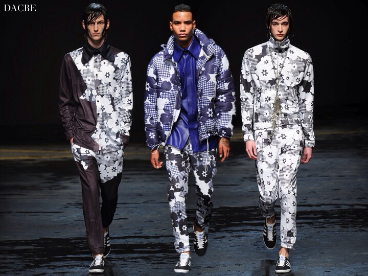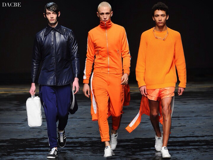 Never heard of him, but I like it. Who made sportswear so different like Christopher Shannon? Ordinary Adidas tracksuits changes into not ordinary costume made of one pair of sweatpants and two blouses. Then, keeping it still chunky and sporty, a LONG sweater comes around. I think it might be a dress, but who knows? And then the unhealthy part- cigarettes. Located on knitwear, colourful cigarette boxes appear. Strange. This is certainly some kind of manifest between healthy life and couch potato lifestyle.