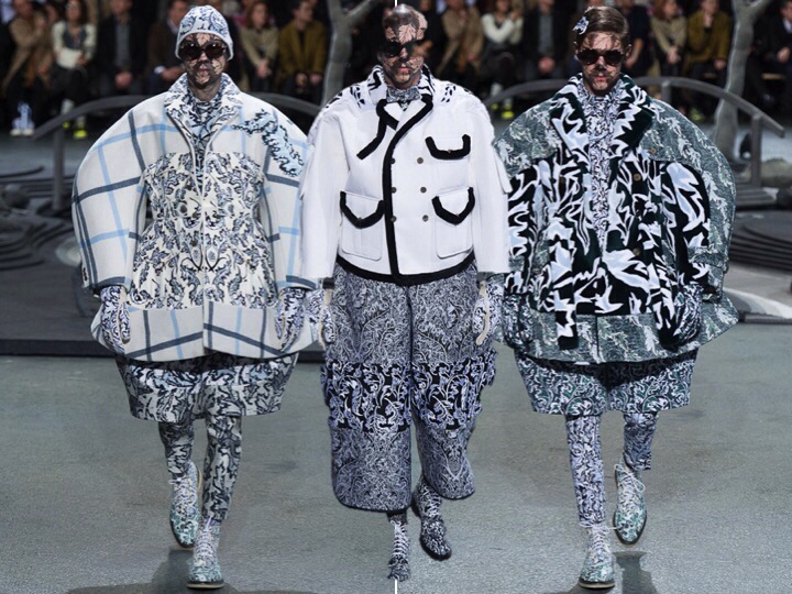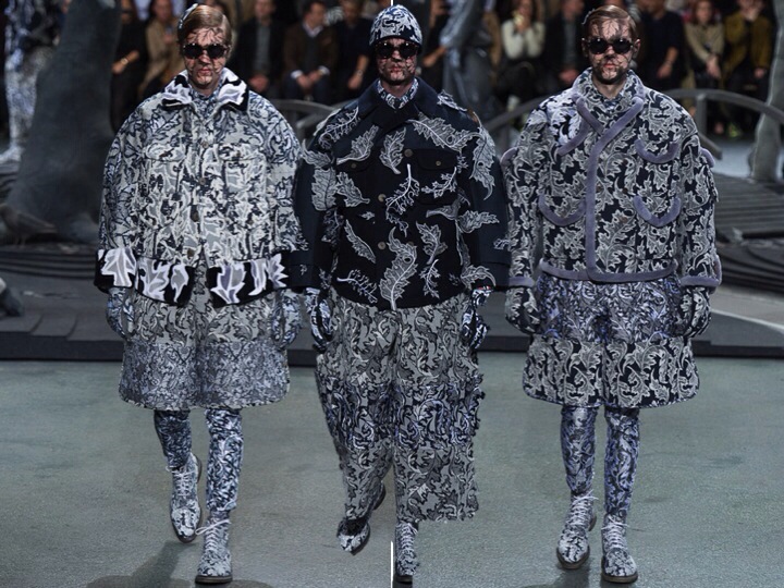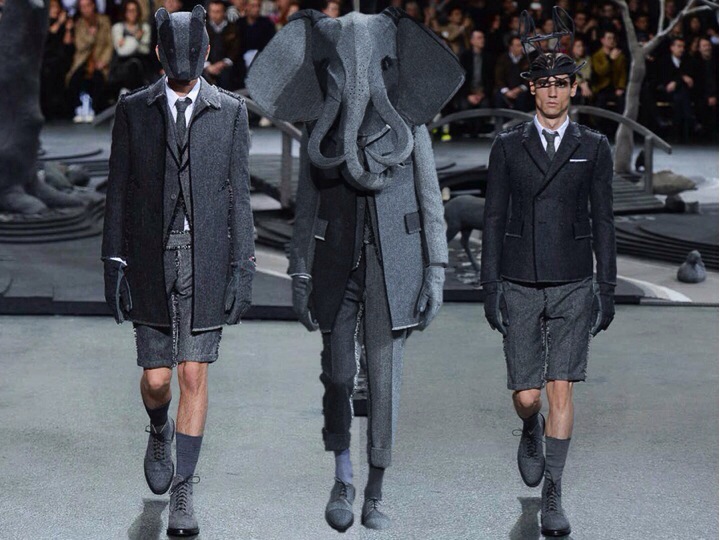 Thom Browne, the enfant terrible of New York have just presented his AW14 collection for men in Paris. In the grey forest full of wild animals, we met the man vs. beast fight- models wore highly tailored suits in abstract forms with bunny, elephant or deer masks, looking like creatures from fairy-tales. The collection was kept in misty grey colour, with lots of embroideries on jackets and trousers. The suites had some mis-proportions in them- too huge sleeves, to filled trousers… Nothing was normal. Not only Thom entertained us with all these illusions and tricks, but also took us to another dimension of tailorship, that he is so good in.