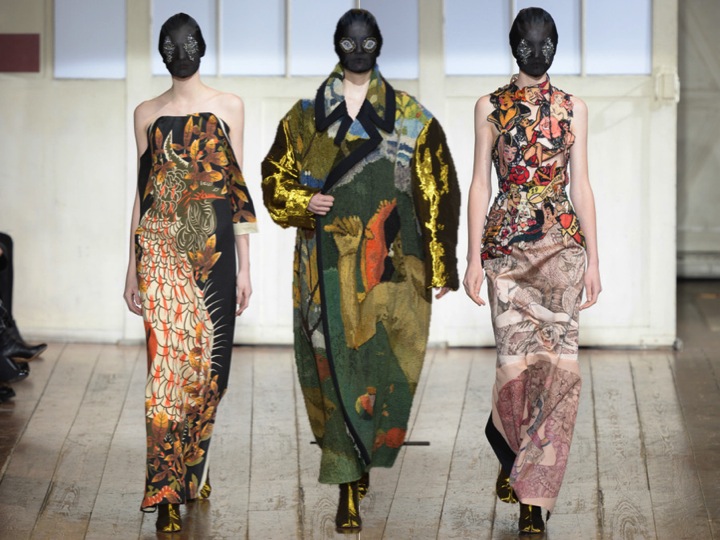 The Margiela team again made some magic for Haute Couture season. And this is a real black magic. Eyes, embroidery, fur, stripes, kimonos, canvas, sequins… art. The SS14 couture for Maison Martin Margiela meant recreating vintage “stuff” into a new, imaginery whole. The collection was about show girls- the tatoo looking like embroidered vest with these sexy pantalons. About illusion- eyes on the veils and handcuffs covered with fur. Brain activity and ancient cultures. So much different things simply touch them selves at Margiela. This is the world of artinasal fashion where nothing is impossible. That definitely was the most amazing couture of the season.