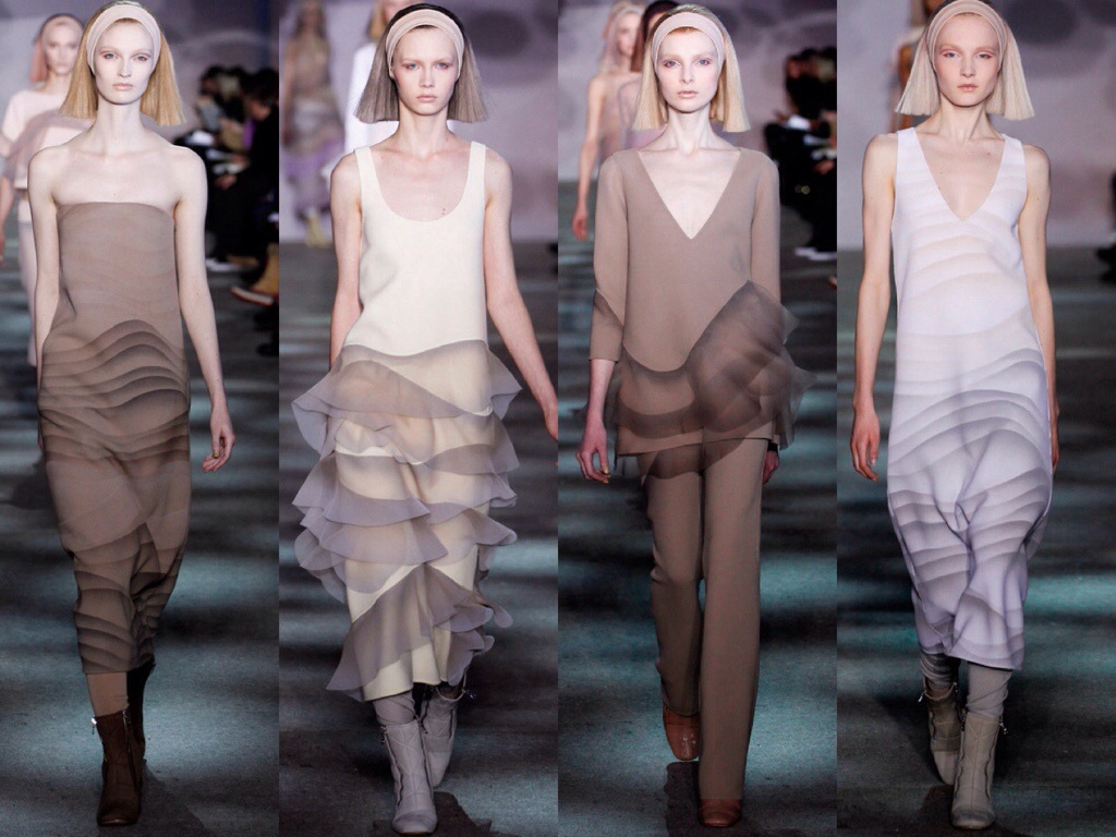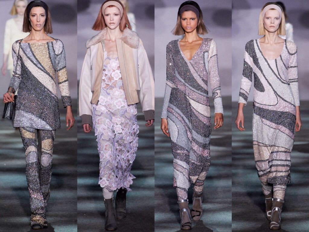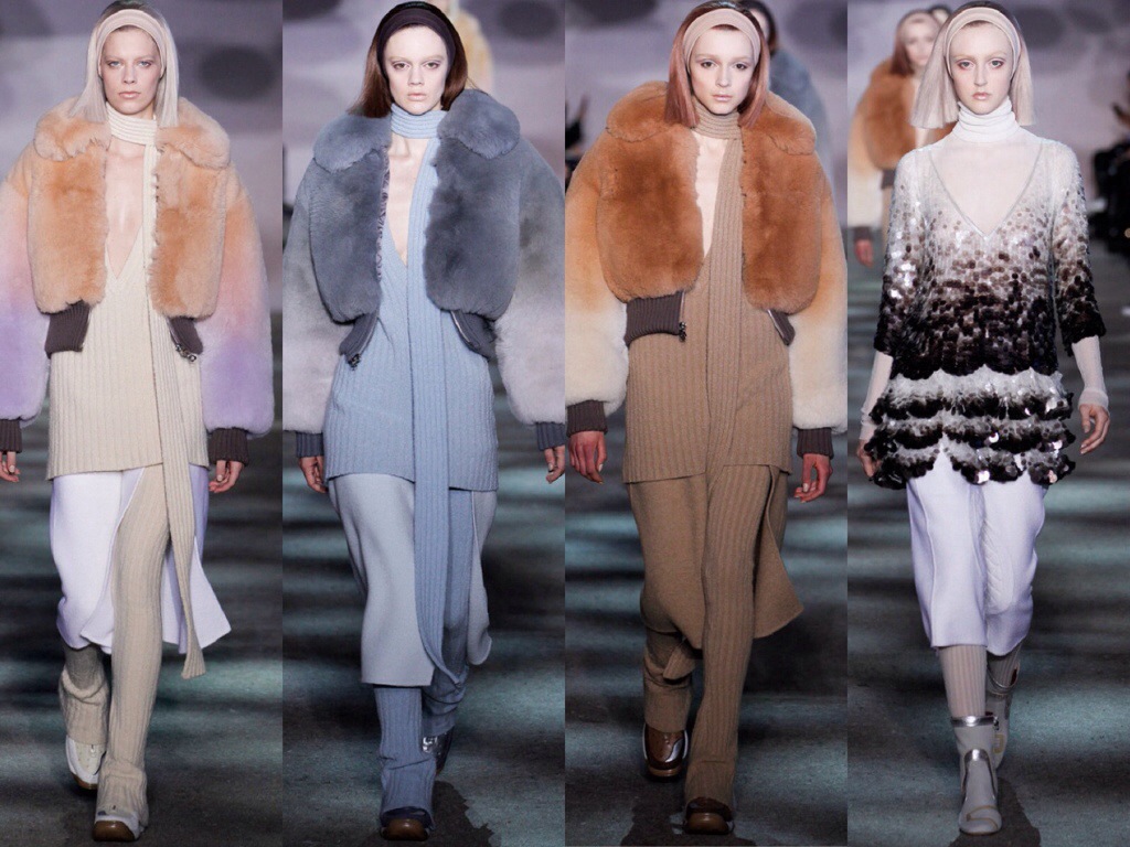 His women, solemn and fragile, reminded me of younger Michelle Pfeiffer and Barbra Streisand style- straight lines on minimalistic, pastel dresses, small boots, pin thin pants. Neutral colours were touched with sweet thanks to apricot coloured fur bomber jackets. And everything seemed to be very wearable…