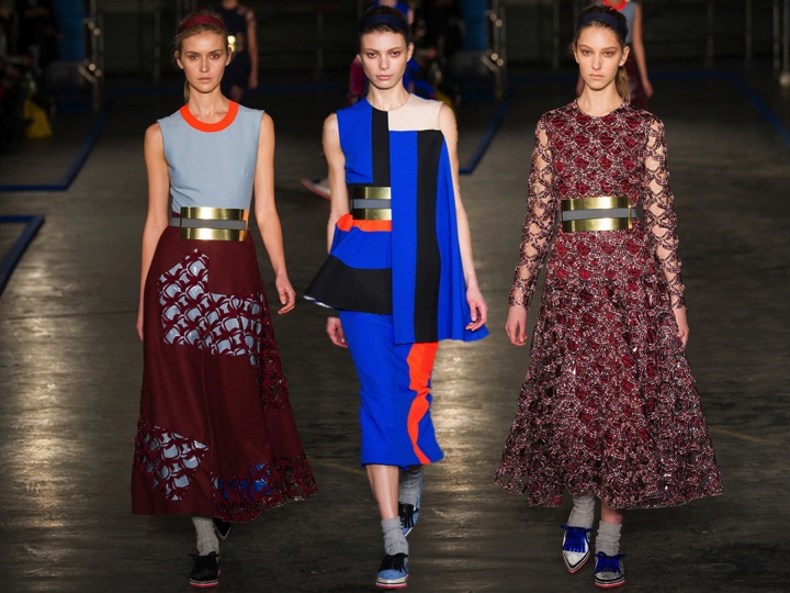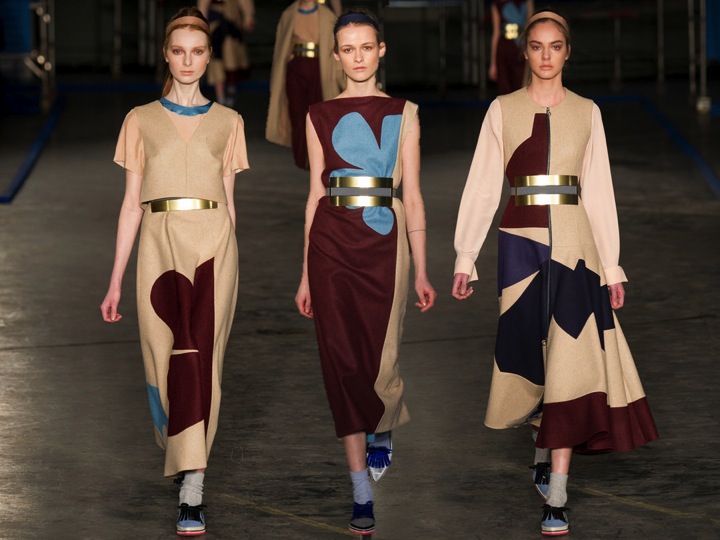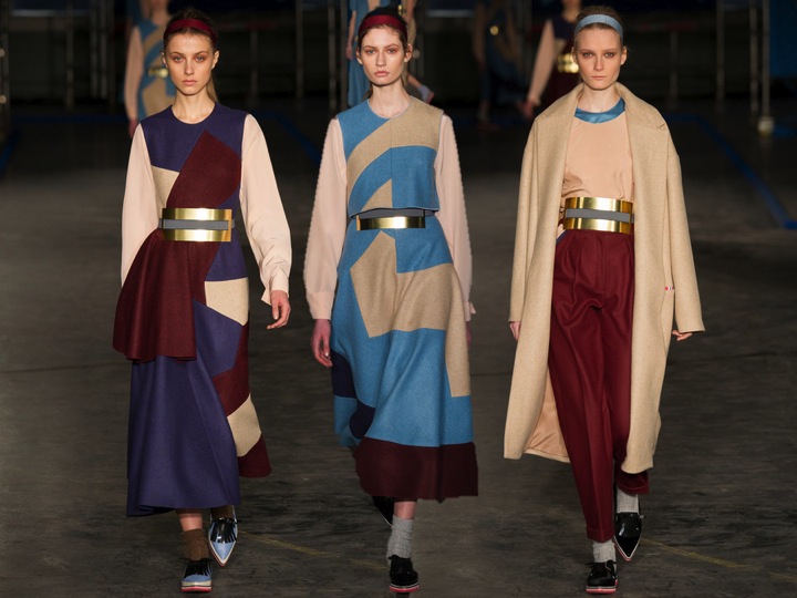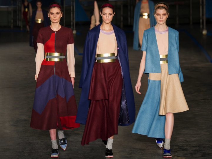 Roksanda Ilincic to a surprise of mine, created a great collection. Really. The show’s colorful, popping patchworks whether it was inserts in long felt skirts or the clear plastic squares that decorated dresses to close the show. Then a added metallic, wide belts for an industrial feel, and a lovely geometrical dress with beautiful coat was created. The deconstructed silhouettes, bright with color blocking had an artistic flair, not least when furs appeared on the runway in a radiant version. With roots in evening wear and artsy attitude- Ilincic outstood herself for this season.