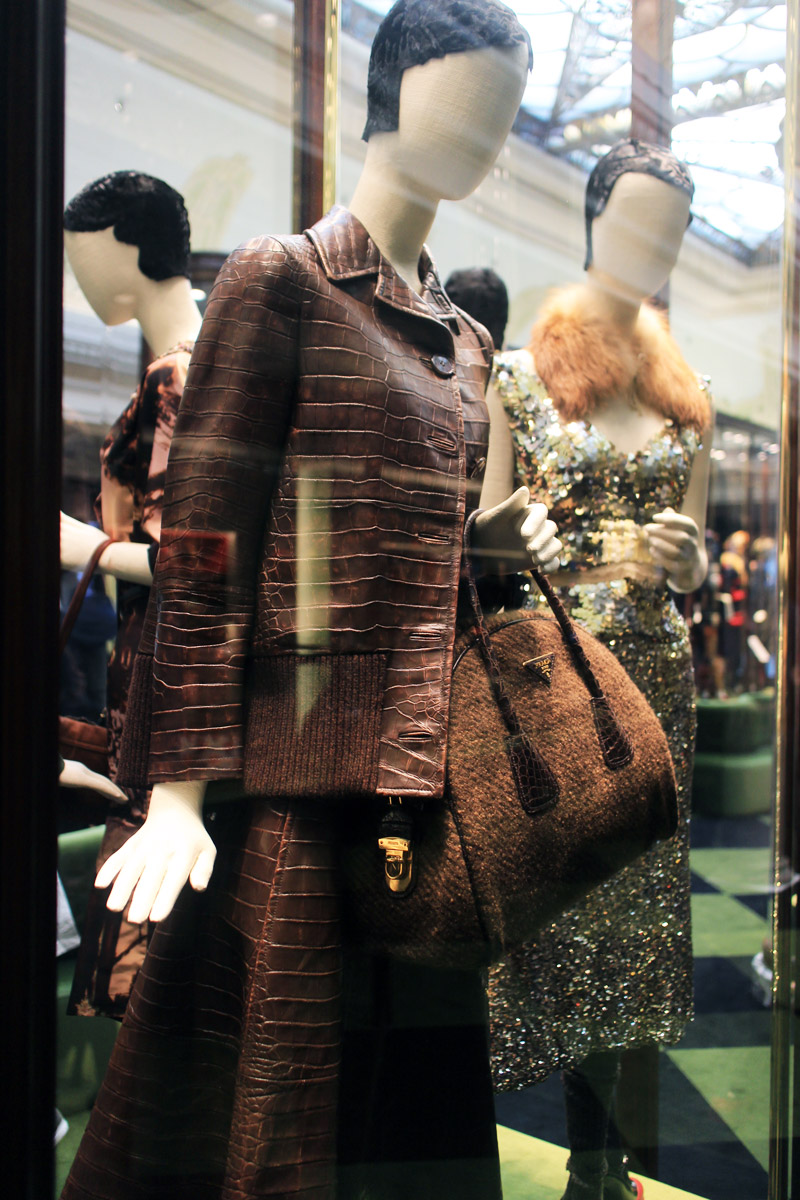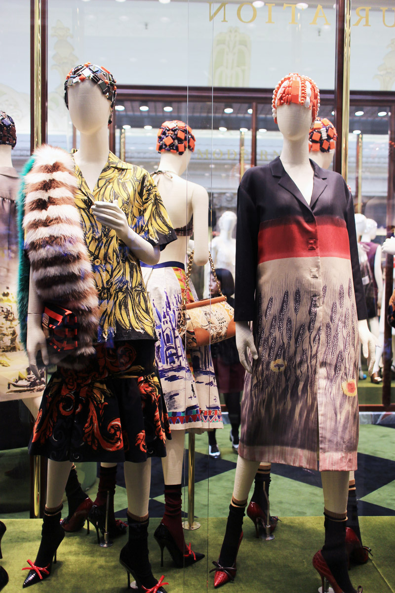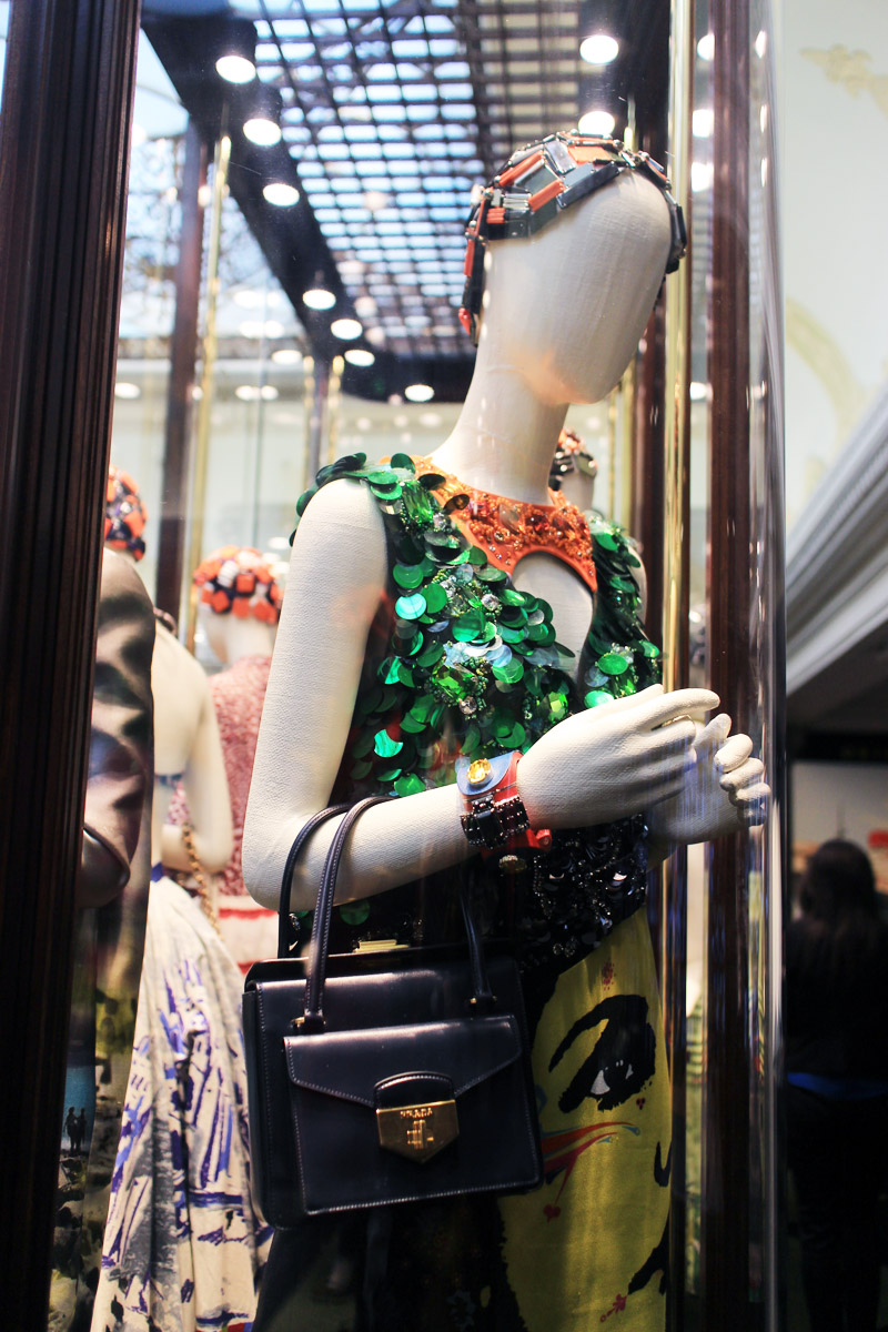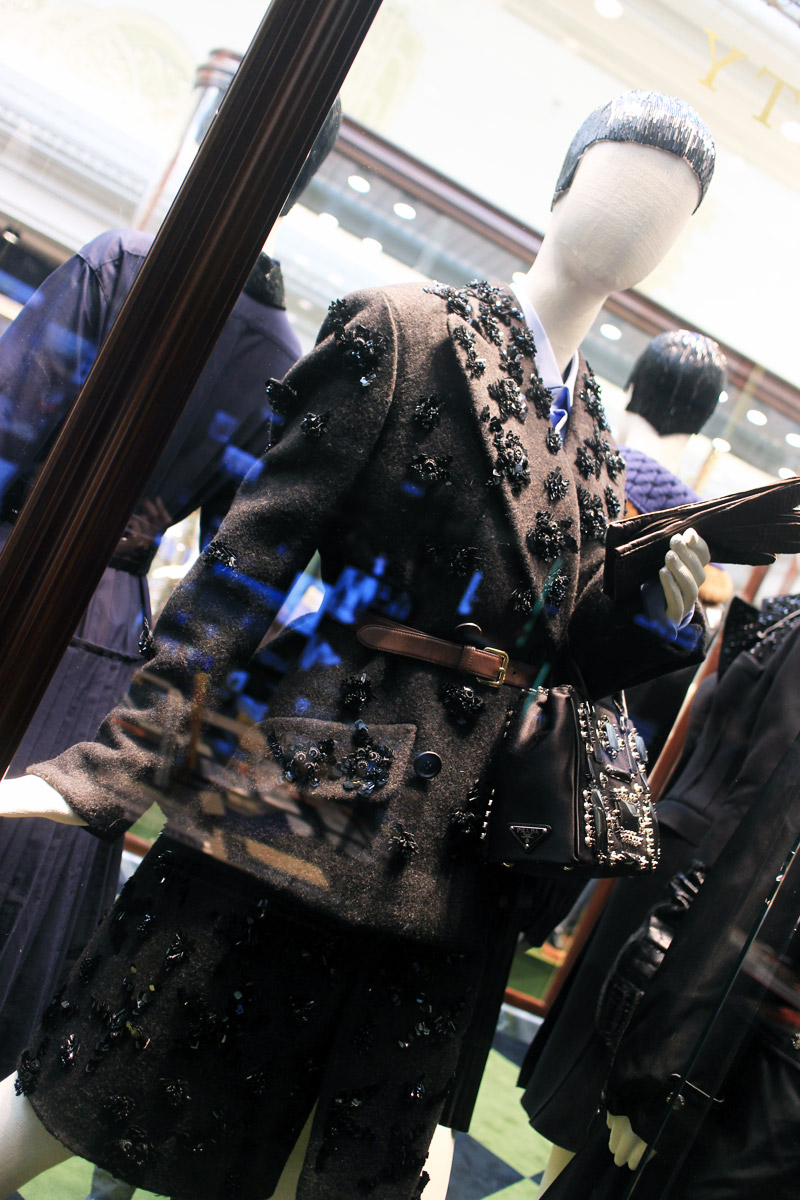 Prada: A cosmos of its own composed of heavenly bodies set in a complex orbit. A universe of contradictions and endless elaborations— noble causes and base temptations— where idealism meets vanity, intelligence meets passion, fashion meets fiction. This is what the PRADAsphere is all about- a huge playground at London’s Harrods, where Miuccia Prada styled each section with her archival (and very new AW14) pieces. The collection that will last till 29th of May is a perfect occasion to remind ourselves the best Prada collections that influenced our sense of fashion and art… the SS10 crystals. The AW13 seductive checks. The SS13 modern geishas. It’s simply a Miuccia Prada wonderland (even all bags and shoes are present here in their own “eco-systems”)! The photos from the exhibition are by Susie Lau.