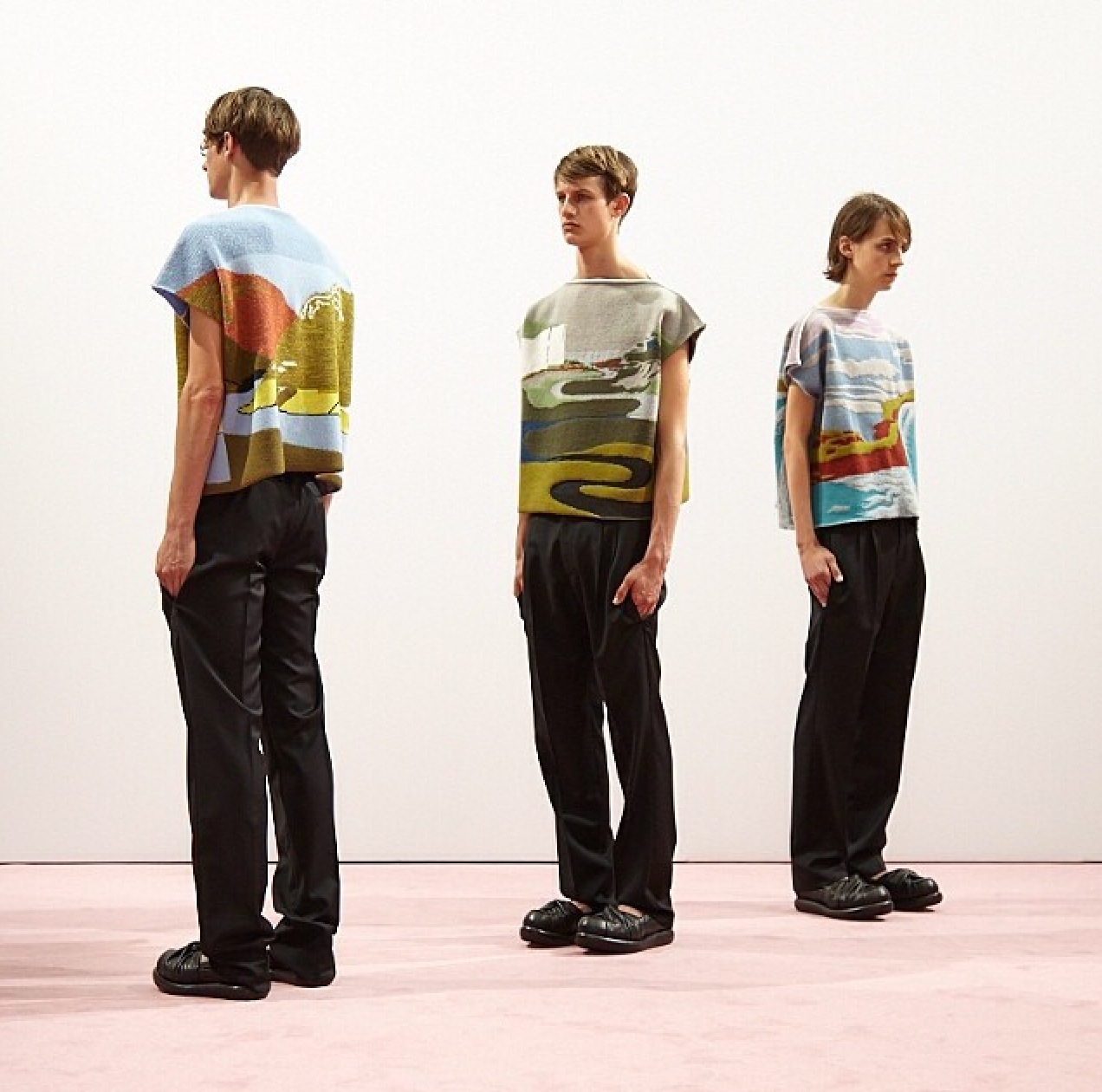 Jonathan Anderson is the strange man in London fashion scene. And this menswear collection proves the point. Scarcely a promising scenario for a collection of mens-wear, but gender blurring has always been an Anderson trait, and here it yielded clothes whose softness and languor were—what else?—oddly appealing, especially in the bias-cut tops that slipped off the shoulder or the hip into loose scarf-ties. “Sleepy eroticism” was the impression he wanted to convey. The collection was one of the disturbingly hyper-normal. Why? Just see the first three looks. Cap-sleeve tops patterned after the work of octogenarian carpet designer John Allen, which were items of bucolic loveliness. True to character, Anderson felt compelled to point out the dropped pockets, which made the models stretch their arms. “A bit creepy,” he mused. “It feels normal, but it’s not.” I myself wouldn’t wear any of these clothes. But after all, I feel that Anderson makes fashion fashion, and not just something to be sold on-line (although his new web-site is amazing). More on http://j-w-anderson.com