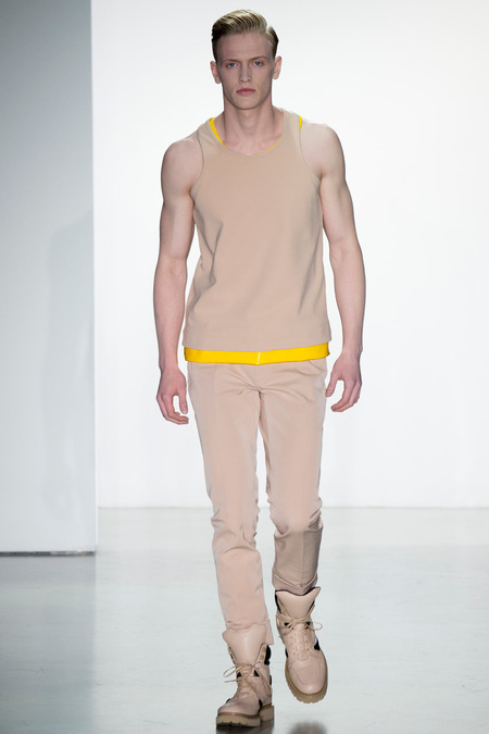 Beige. Beige. Beige. And then a little drop of yellow; little splash of red; and the whole red / yellow / orange PVC sweatshirts appeared. That was possibly the most dynamic change of action during the whole Milan Men Fashion Week! Calvin Klein summer was a sportish collection full of casual shorts, trousers (I love the cuts) and tank tops, that went through reincarnation of their colour. “Transparency is very important to move ahead with straightforwardness and simplicity” said Italo Zucchelli, the designer. I just want to add it reminded me of Miu Miu for AW14 (these vinyl!)…