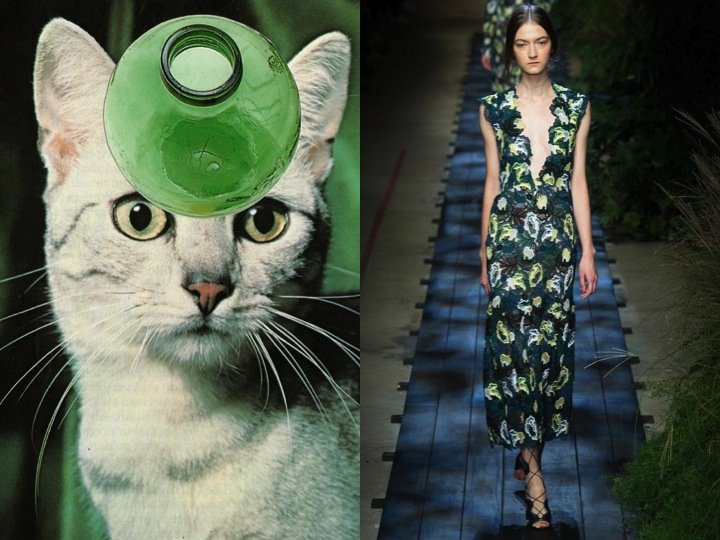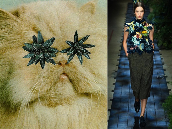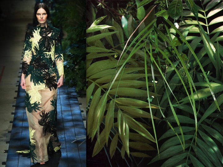 Oh, what a show was that Erdem! It was breath-taking. On Moralioglu’s mood board, we had pictures of Katharine Hepburn in The African Queen, a proper woman “going bush,” unhinged by the jungle. That was the set today: dull, dark, slightly sinister. And that was also the scenario. Except that the woman Erdem had in mind was Victorian biologist and botanical artist Marianne North, who traveled the world and defined her profession to the point where there is a gallery dedicated to her at the Royal Botanic Gardens in Kew, outside London. With amazing, Valentino-like tapestery and embroideries, the plasters of palm leaves, roses and other plants simply grew out from the dresses. Erdem compared that to “trapping something wild.” And it was the wildness of nature, rather than its order, that truly absorbed him in this collection. And all of that magical beauty was styled with simple, boyish broques. And that’s the essential Erdem look. Feminine, but with a masculine touch. Art by Stephen Eichhorn.
