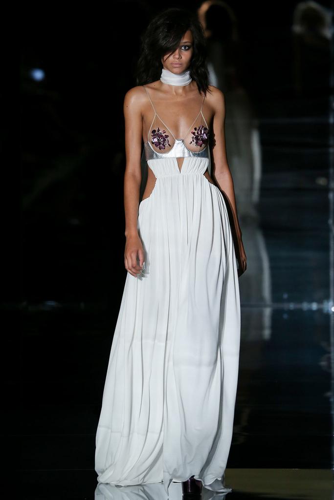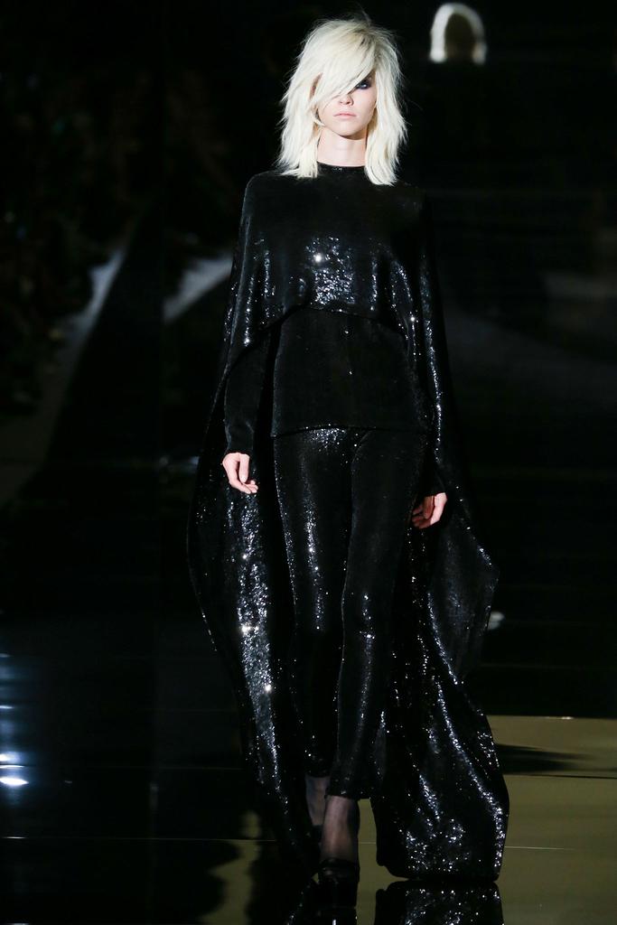 Tom Ford sexy ups his label with every season. But this was over the top! Tricky velvet suits, sheer tops, sequin flowers sticked to nipples, Gucci-esque white gowns… a real show-girl time. The soundtrack was a narcotized female version of “Addicted to Love” (the vocalist’s emphasis on the addiction, rather than the love), to which extraordinarily proportioned girls—rail thin, seven feet tall in their platform clogs—teetered down the mirrored catwalk, eyes laden with mascara, hair in teased-out shags. Tom’s SS15 isn’t really about the “sexy” office go-out, but it’s surely for women which feel sexy in their skin… and attitude.