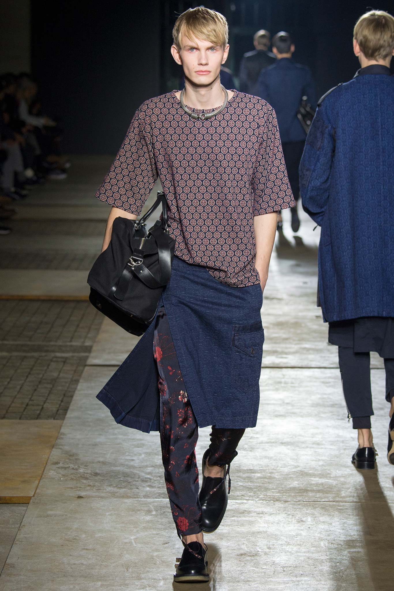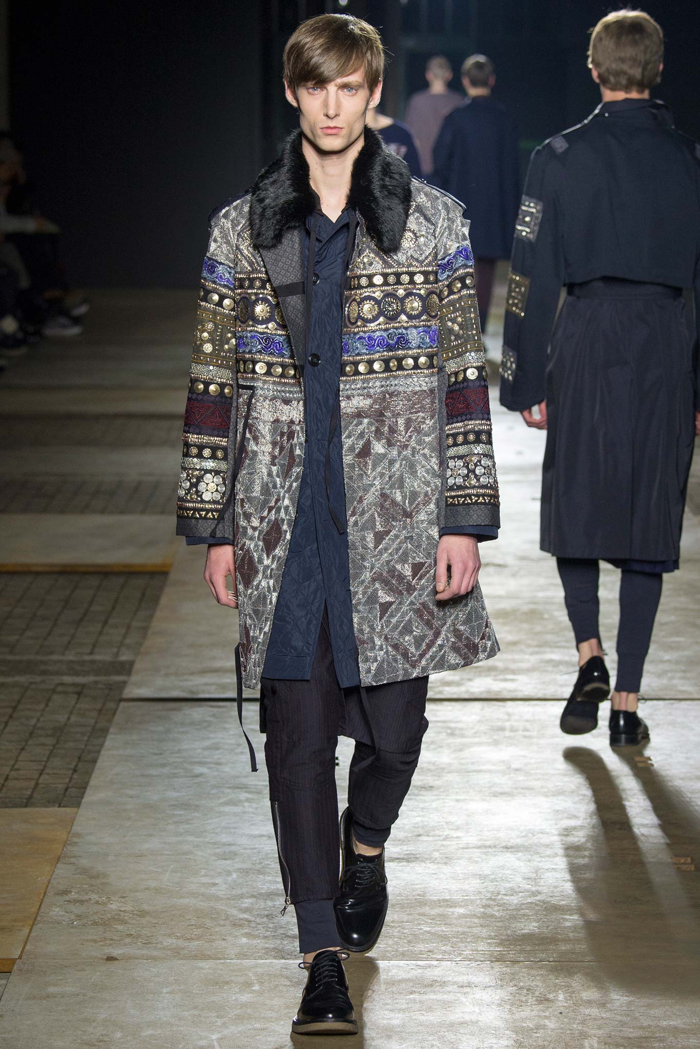 Dries Van Noten’s collections always feature some oriental motifs and embroideries. This time, he brought on Tibetan embelishments, Chinese satin and Burmese metal jewellery. The coats covered with flickering mirrors, crystals and other appliques looked so gorgeous. Just like the red sweater cover with knitted prints. There is an air of the nomad about a Van Noten collection. It’s likely something to do with the historical past in Antwerp, Belgium, once a merchant hub of the world, from where Dries started his career. The layering is on master level – khaki bermuda shorts worn over tailored pants. Tank top on a printed shirt. This ethnic mood working on me.
