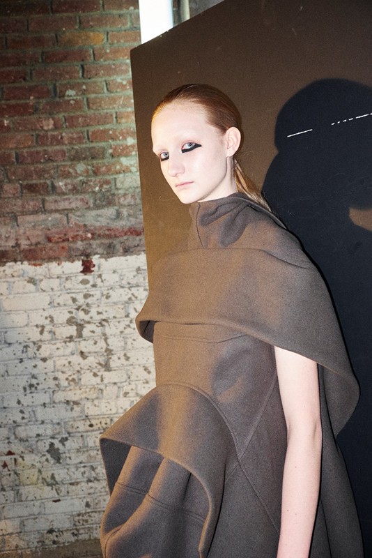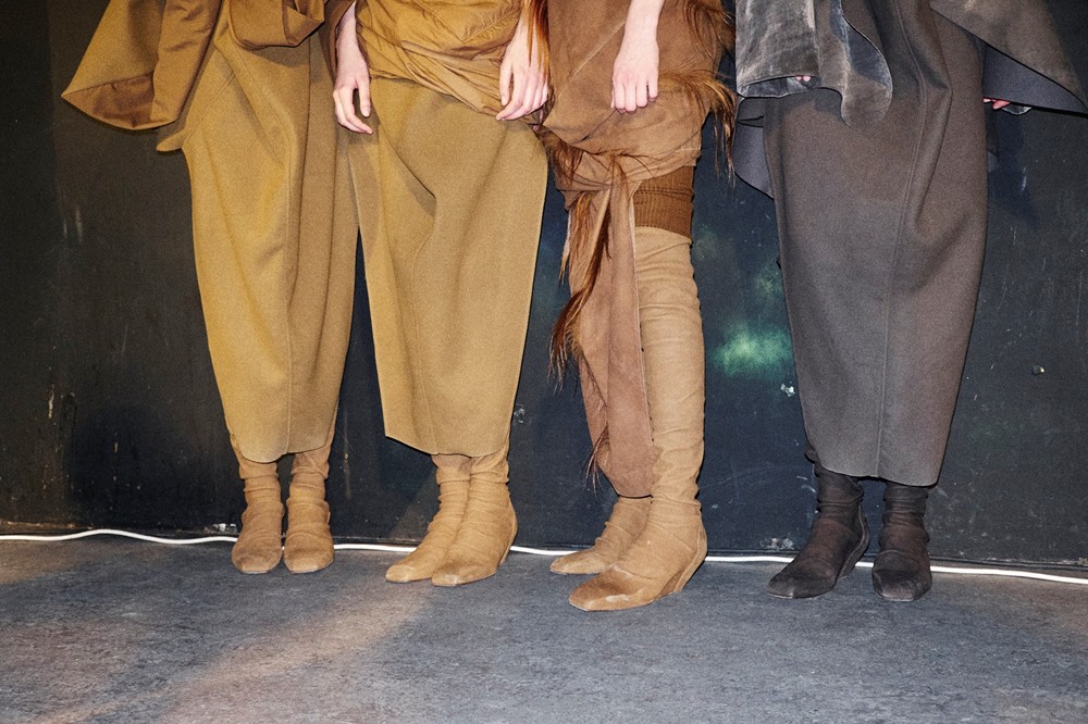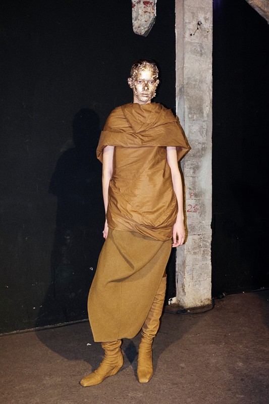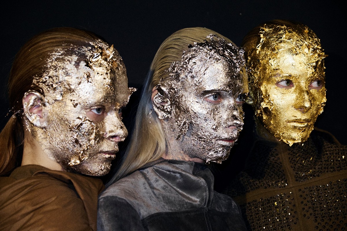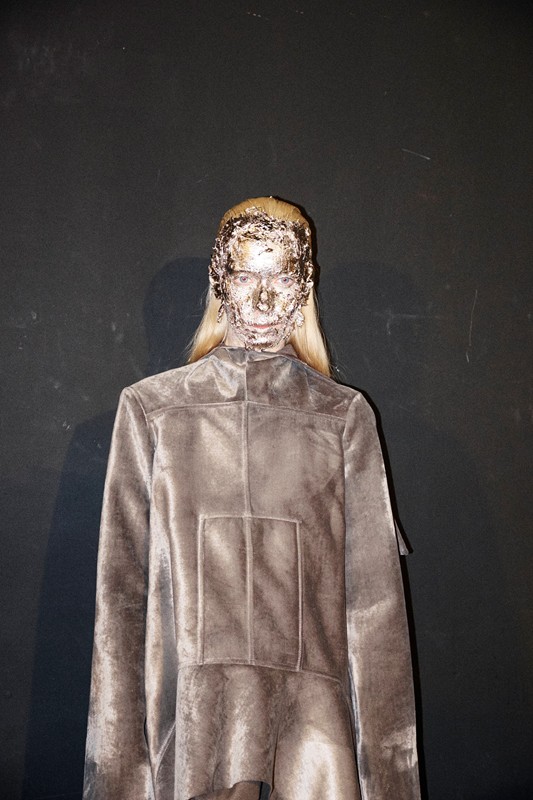 After the menswear show, I thought that Rick Owens will go full frontal, too, for women. But he totally took another direction – wild and gold were the keywords of the collection. The models had gold and sliver plated on their faces while hair of different animals jutted out of the savagely tied and layered tunics and dresses. The final effect is strong, I must say – the models looked totally out-of-this world in this type of styling. If talking of the clothes, we’ve got some interesting embroidery and detailing; the colour palette is earthy and surprisingly warm us for Rick’s dark world.