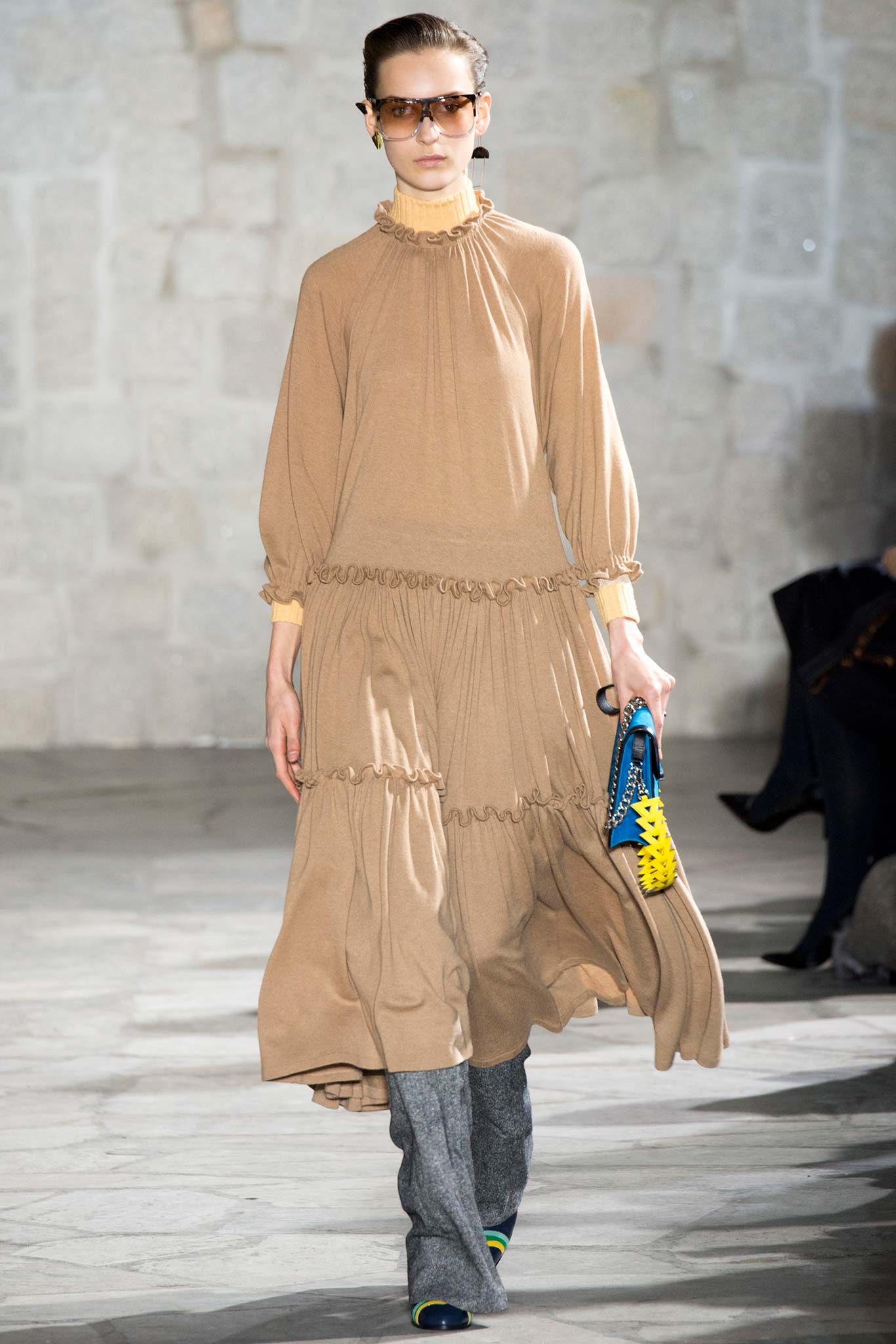 Jonathan Anderson’s second women ready-to-wear collection for Loewe is a fresh look at a traveler’s wardrobe – tweed pants, comfy over-sized jackets, warm cashmere turtlenecks and easy dresses are just few of the new basics Anderson offers for the luxe voyagers. And just to heat it up, the British designer mixed bold, colourful accents with seriously good accessories – the Puzzle bag in blue or emerald suede is everything .”Like Spanish women,” he added. “They know who they are, they know how to have fun.” The Loewe woman for fall thinks about flirting, too – the huge sunglasses said it all. The azure pleated skirts drifted through the air in a very romantic way. Although the collection reminds me of J.W. Anderson’s London presentation, it still leaves a positive feeling.