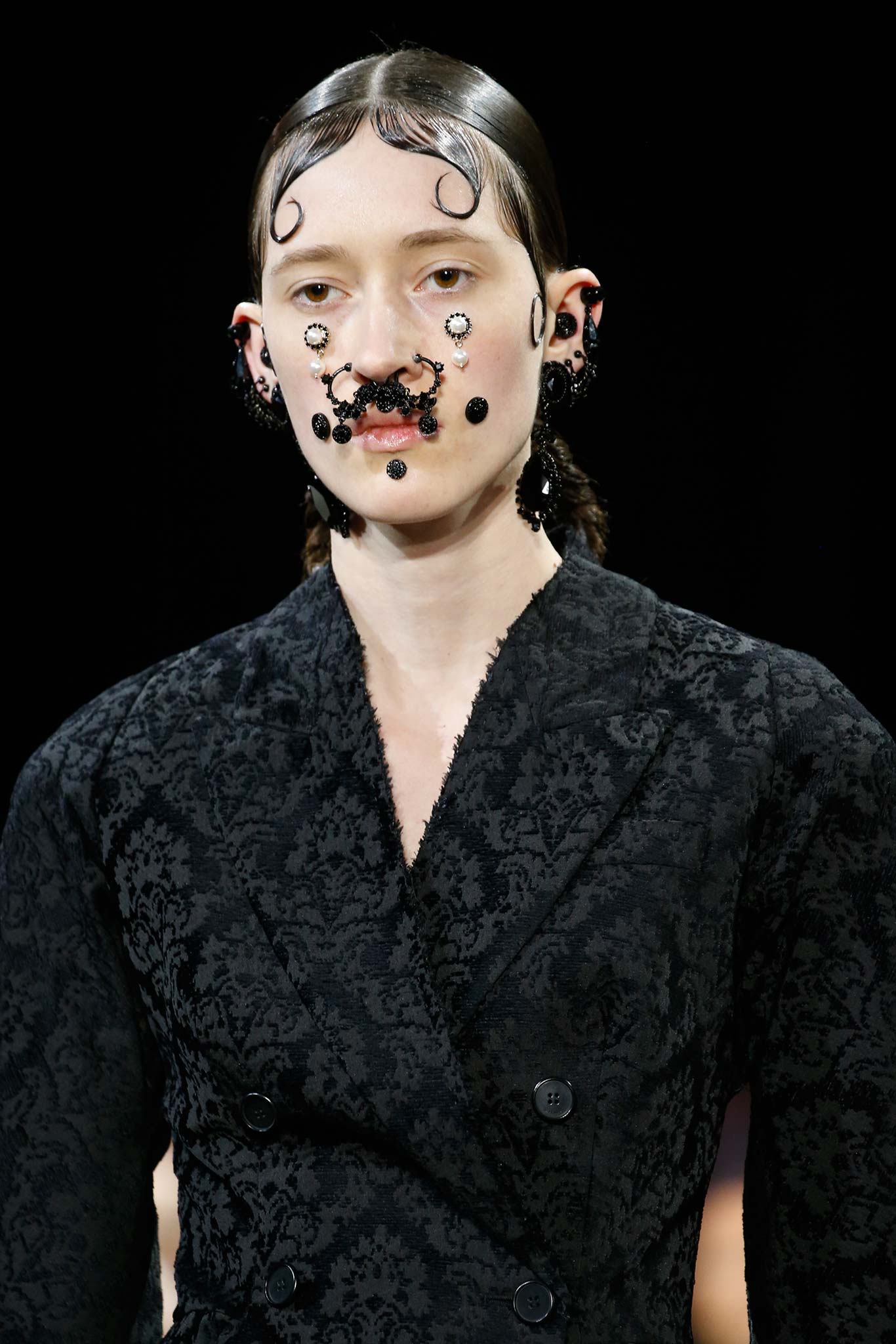 Rather than make-up, models wore jewellery at the Givenchy show. For AW15, Riccardo Tisci went classy Victoriana with blooms of sportwear – jacquard blazers, slim tank-tops and enchanting lace gowns made me think of Altuzarra which showed earlier this month. The opulent, dark side of Tisci is well known to us – he serves it to us each season. There were a lot of old signatures which seem to be flipped every three months by Tisci like a old steak on a grill party. The religious prints, the cut-out skirts or even the peplum is all a deja vu. I need some fresh air at Givenchy. Please.
