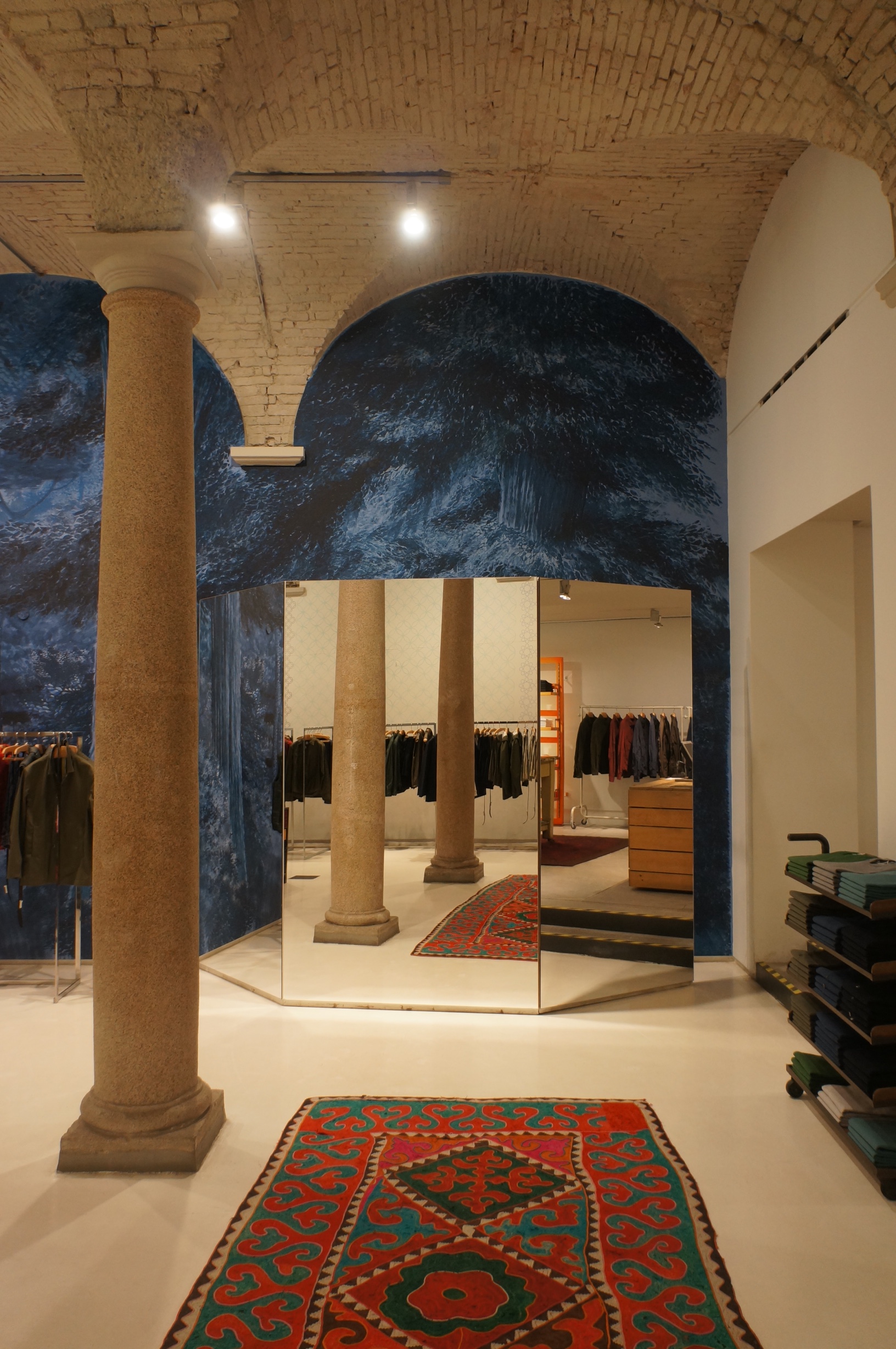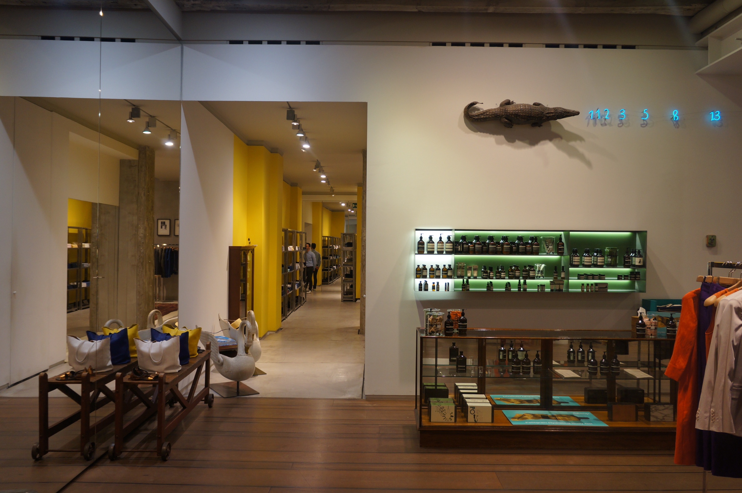 Aspesi store in Milan is one of these spectacular places, that you want to visit as often as it’s possible. The ground-breaking contrast of marble columns and plastic box tables makes the store not only attractive, but also an experience. Although the clothes by Aspesi always seemed to be a bit boring for, the interior makes you forget about the “every wardrobe’s basics” – ethnic colours, bold cushions exuding with gypsy bohemia, crocodiles jutting out from the walls, grandiose metal panels and gorgeous hangers – all of this make me drool and think, that there are no more rules in designing a store or any other concept. Fantasy and creativity is the most important, and Aspesi architects approve.