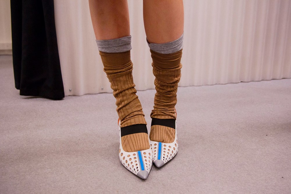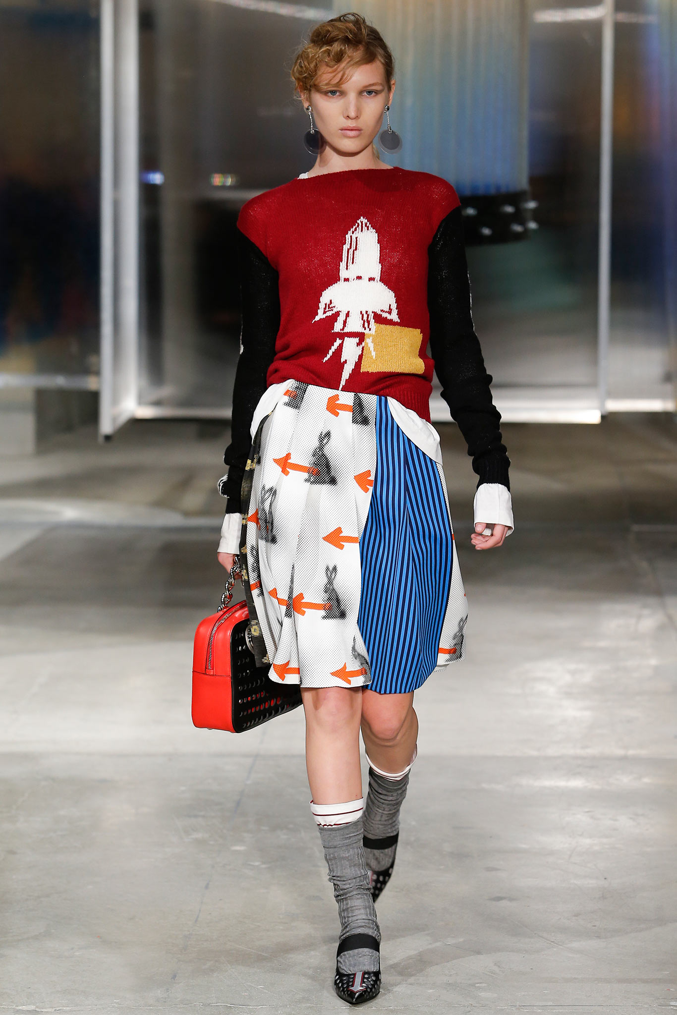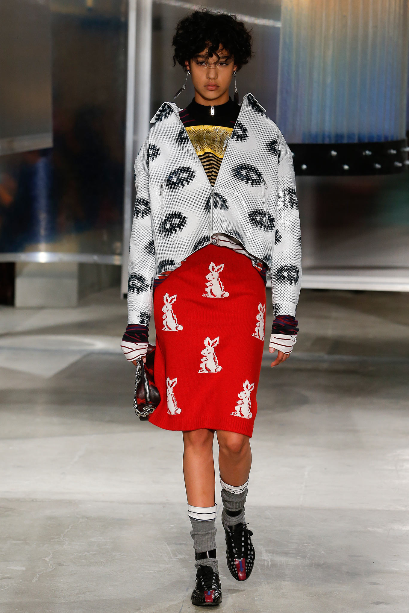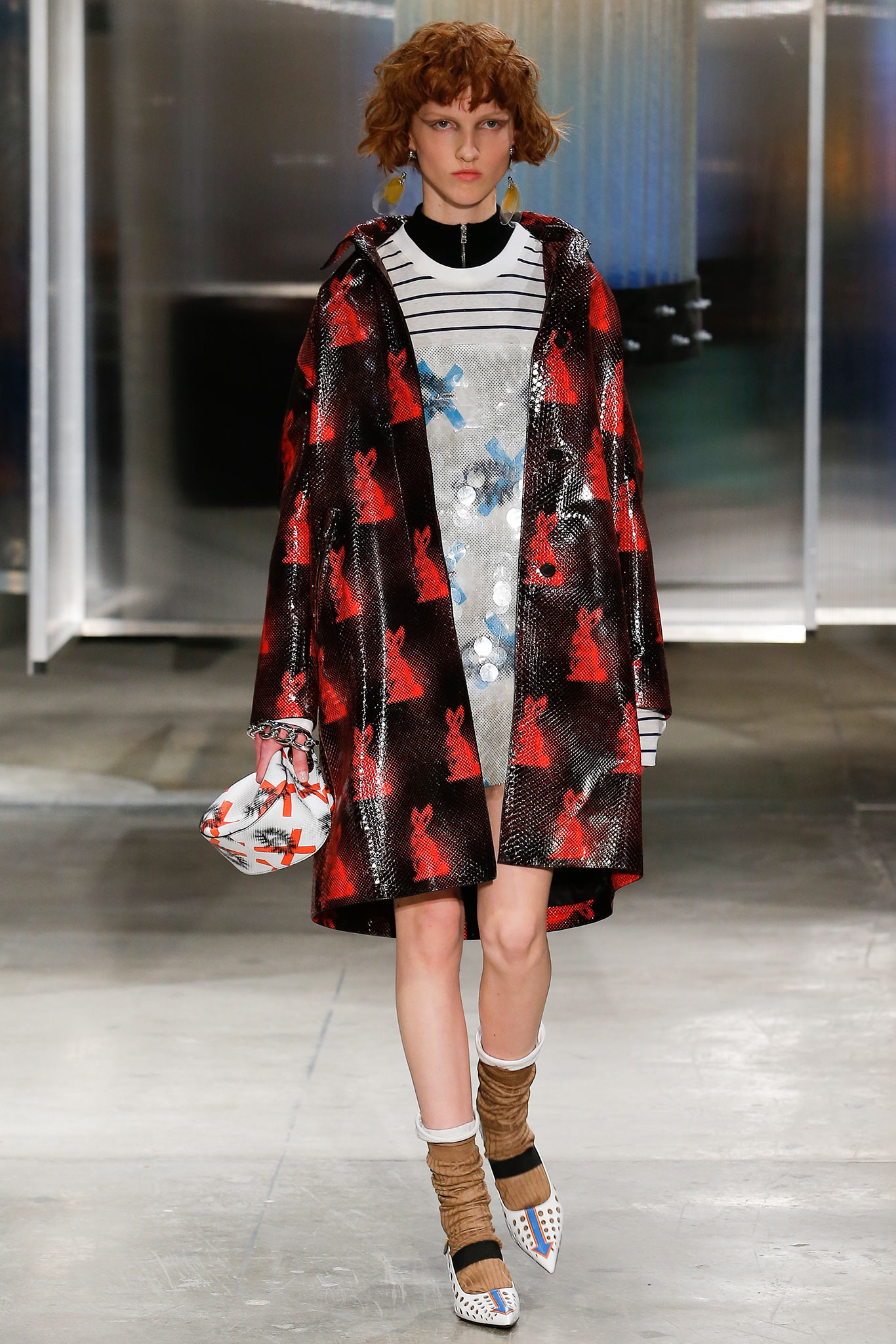 As usually, Miuccia did not forget about girls. In this collection, almost 50% of the models were girls. And their outfits did not really differ from the boys. Slouchy, over-sized rain coats; mini python skirts; same, pixellated prints on knits, which told a story of naive childhood, where the boy dreams of being an astronaut while the girl is pretending to be a bunny. However, the collection definitely told a more “parental advisory” kind of story – one of the main inspirations behind the women’s collection was the famous film, Female Trouble by John Waters. The cat-eye makeup and kitten heels with socks instantly transported us back to Chicklette and Concetta, the symbols of bad-girl defiance from Water’s 1974 work of genius. These troublemakers have made their presence in Miuccia’s world more than once (Miu Miu SS15, for instance). As you see, there is always a kind of pleasure while interpreting Miuccia Prada’s collection – even though some are definitely not in my taste. This collection represented a mingle of many topics and ideas – childhood, femininity, fake modesty and of course, ugliness. All of those often appear at Prada, but they are always presented in a new, reflection-causing way.