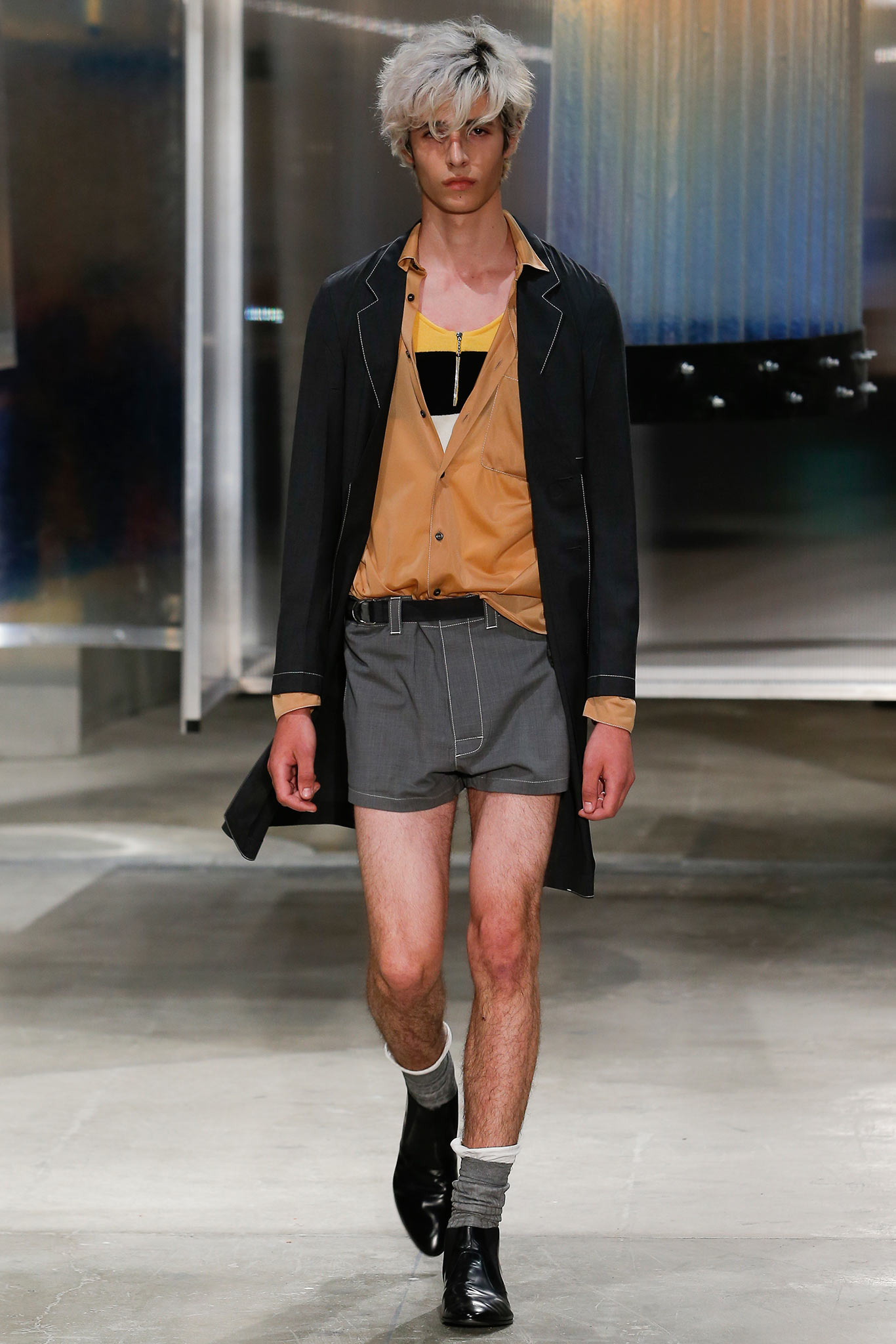Youth and naive were the main keywords behind the recent Prada collection for men (and women). Miuccia Prada made everybody confused this time, bringing on the wardrobe of messy, skinny boys, which wear over-sized socks, “poor looking” sweatshirts and turlenecks-under-shirts. I am not just uncertain about what it all means (the rabbits and rockets on knitwears, the post-Soviet attitude kept all around these clothes), but whether I actually like or dislike the collection, as Prada bases her ideas on the power of ‘ugly’, transforming it into something strangely desirable. By that, I mean the clothes from SS16 are not beautiful at all – they are definitely ugly. The way the models wore the jackets; the perverse short shorts; even the creepy colour palette made it all look like a wardrobe of a crusty. It felt like seeing a Gosha Rubchinkiy show, but sponsored by a major luxury house.