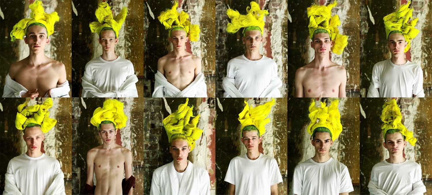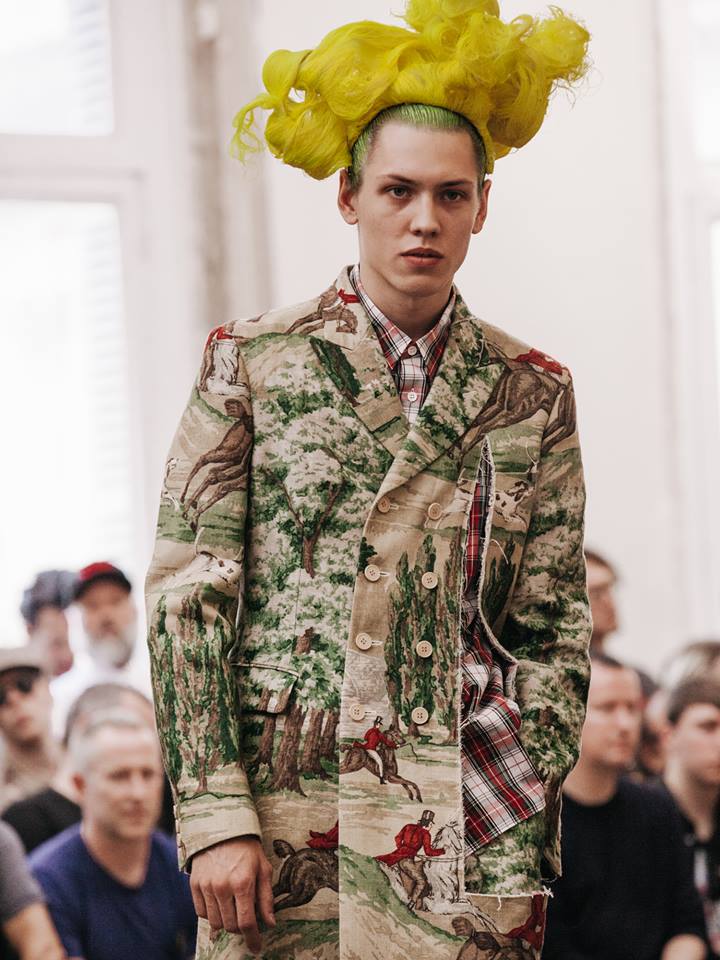 Rei Kawakubo and Julien d’Ys are a perfect creative couple. She is designing clothes full of intelligent innovation which is in perfect symbiosis with history of fashion. He is the “hair artist” who does mind-blowing head creations. Comme des Garcons for men’s SS16 is an explosive fusion of Louis XVI nostalgia and extravagant modernism. This season, d’Ys created towering neon yellow bouffants, a striking contrast to Kawakubo’s collection of revisited suits – which saw trousers slit down the legs, jackets with their collars removed or silhouette unexpectedly severed, and shirts that hung in tatters. For the hair d’Ys was given free hand by Kawakubo to take the direction he wanted. “I have to have freedom,” he says, speaking after the show. “If somebody said to me ‘OK, I want that’, then I can’t do anything, I can’t! I’m completely frozen because I have to be very free and I have to love the person that I work with.”