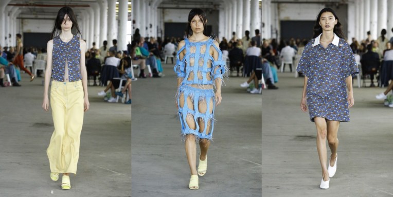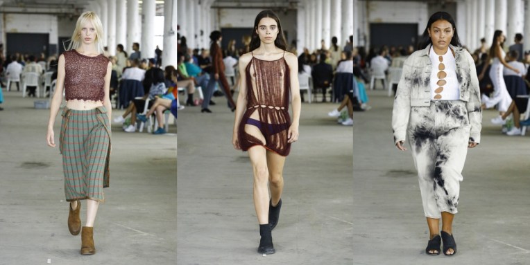 Industrial space in the heart of Brooklyn’s Bushwick. The sound of children’s instrumental performance, played on home-made tambourines and other metalware. One thing’s clear – an Eckhaus Latta show is about to start, which also means a radical leap away from typical, glossy Manhattan presentations. For Mike Eckhaus and Zoe Latta, the runway is like a multi-faceted concept, that doesn’t only focus on clothes. It has to hit the senses, from sounds to visuals, and make you observe, not just stare at another dress. Even the model casting – one of the most diverse throughout the entire fashion month – has a lot to speak about the topics of age, size and skin colour. But don’t get it wrong. The fact that Eckhaus Latta works against the fashion establishment doesn’t mean that the clothes themselves are on the second plan. Somehow, the designers are able to always pull off this artistic edginess, but in a deeply sexual way – I don’t mean the sheer pieces only. Maybe it’s the rawness of those ‘unfinished’ tweed skirts or the oversized creased trousers. Not speaking of the distorted sweaters and the marvellous spider-web dresses made from wool (extraordinary knitwear is becoming Eckhaus Latta’s signature, from season to season). Other than the ‘everyday’ pieces, the designers also offered a few garments that could be easily put next to contemporary artworks in a gallery. The meticulously beaded tops for both women and men had cuts that sharply exposed the body. But Eckhaus Latta’s clothes are not complete without its wearer, that’s why it’s wrong to call them solely ‘art’. It’s the person’s character that make the clothes ‘breathe’ in a way.