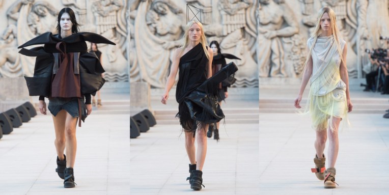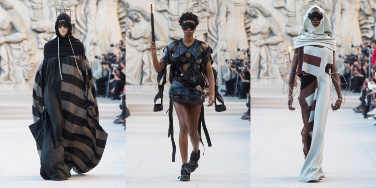 Rick Owens’ spring-summer 2019 collection wasn’t just another Instagram-worthy fashion spectacle. True, the burning, wooden installation in the middle of Palais De Tokyo’s backyard was quite a visual attraction. But in fact, the designer himself did something that you very rarely see in the industry. Something that isn’t straightforward appealing or so-called ‘good for business’. Owens showed his anger and frustration with the current system of not just fashion, but… everything. “I’ve been frustrated with how straight the world can be, how petty,” Owens said, explaining his motives. “Just the process of getting permits to do this (the fire) was tedious”. The garments felt as well as a call for a riot, defiance. Some of the models carried torches and looked like cosmic witches wearing enormous sunglasses and cocoonish garments. Others had metallic head wears and stiff, XXL braces on their hands. There was something very dystopian about the nomadic, floor sweeping coats made of mesh-like leather. Where are those women marching? Or are they heading for the fight? You could also have an impression of a witch coven that is about to start a world-shaking sabbath. Whatever it is, Owens seems to be raging, and so, he directs all those emotions into his deep, multi-faceted work.