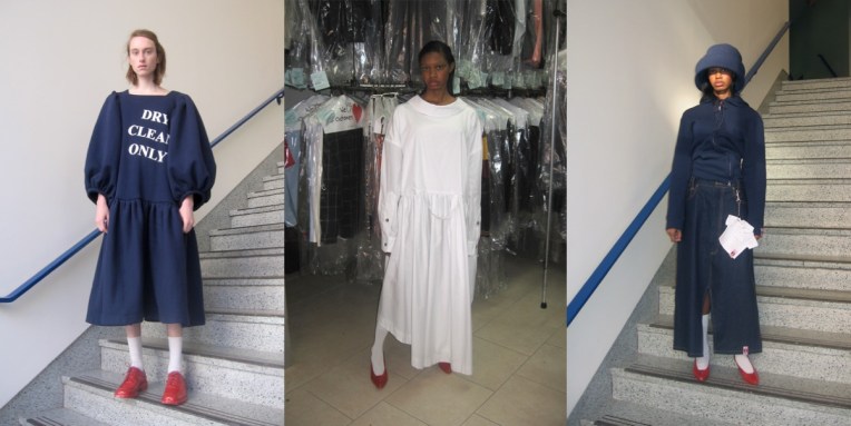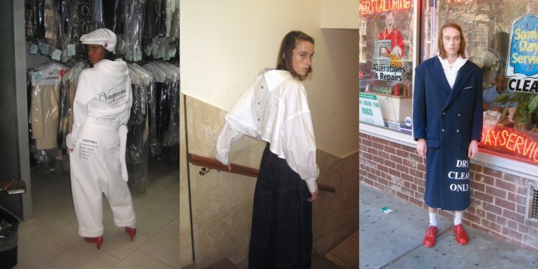 Vaquera’s Patric DiCaprio, Claire Sullivan, and Bryn Taubensee are New York’s young avant-grade of fashion. But even the biggest enfants terrible need to grow up someday: here’s the first pre-collection coming from them. For Pre-Fall 2019, Vaquera’s designers remade some of their brightest ideas into a capsule of clothes and accessories at prices their younger fans can truly appreciate. They designed fewer than a dozen silhouettes, some of them recognizable from past shows, and limited themselves to just three materials: a cotton poplin, a dark-rinse denim and a sweatshirt fabric (look at the distorted, white track suit – it’s genius!). Smart move. Vaquera called this their “Garment Care season”: they introduced dry cleaning slips and printed the back of hoodies with a Vaquera dry cleaners logo. The collection’s sock bag with its coin-purse clasp is a nod in the direction of Martin Margiela, who did same with a leather glove two decades ago. Fun tailoring and even crazier shirting might be a harder sell, but then, Vaquera doesn’t want to lose its arty edginess it became renowned for in the city.