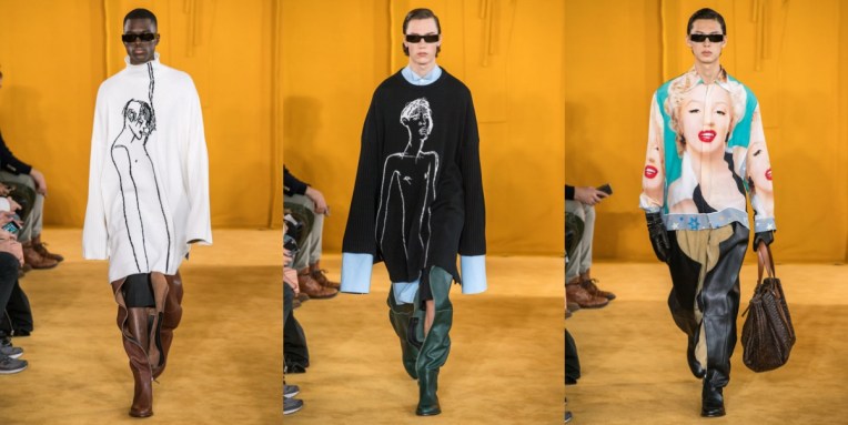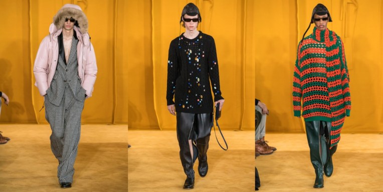 Loewe’s decision to show its menswear during Paris fashion week couldn’t be better. Jonathan Anderson’s exquisite work for the Spanish brand has to have the motion of a runway. A look-book/showroom presentation doesn’t necessarily work that way, so the previous seasons for men felt a bit under the radar, and even… still? But the autumn-winter 2019 line-up was exactly that: vibrant, bold, full of energy, and optimism that was beautifully reflected in the joyously eclectic elements of the collection. Let’s start from the beginning. A yellow, canvas sculpture by Franz Erhard Walther was the focal point of the show space at Maison de l’UNESCO. Fragments of clothing were strapped to the freestanding piece (‘Gelbe Modellierung’ from 1985), which resembled the cross-section of a wardrobe. Walther’s artwork influenced Anderson’s designs this season, as they were all about mixing, matching, deconstructing and, lightly saying, playing. As usual with Jonathan’s work at Loewe, everything was very artisanal and made with great affection. Whether we’re speaking of the XXL, rough-looking cardigan made of different yarns and threads, heavily patch-worked sweater or a trench coat constructed out of wool scarves. But the collection’s ‘show-stealer’ award goes to the boots. Well, not just regular boots. We’re talking of unzipped boots, going all the way up to a belt. “We were looking at gaiters and fishermen. It was early-’80, kind of, when we unzipped them. It created kind of flaps – Western, but non-Western. It was how to take something fetish and de-fetishize it.” This sort of ‘odd’ seduction was as well applied to tailoring. Looks were slim in the torso, with flared pants. Some of the suits were in houndstooth (styled with a pink puffer jacket), some had a one, satin lapel. “We’d done the suit in the women’s collection – we kept the waist, and extended the back,” said Anderson. “There’s something quite chic and suave about it.” The tailored pieces reinterpreted the nearly forgotten, cosmopolitan elegance of men. Others felt like they were suited for an adventure, or were brought back from some remote destination. Collected and curated into an outfit – like the huge ‘fishnet’ knit or the multi-coloured, fringed bags. Summing up. Together with Marni, Loewe is my ultimate favourite of the season.