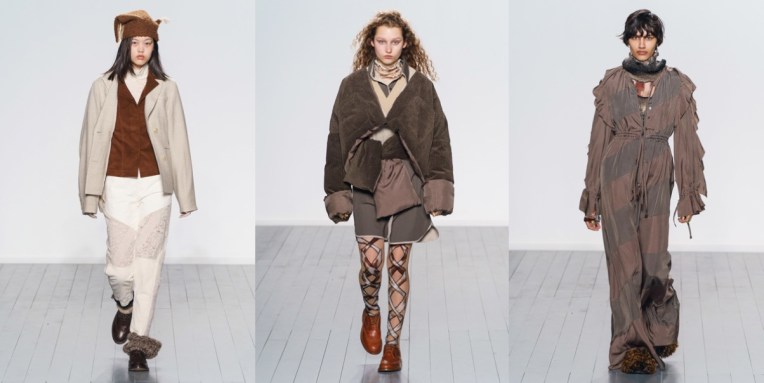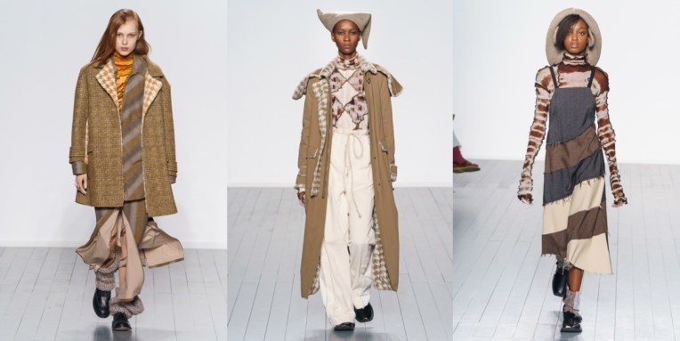 London born and based designer A Sai Ta launched his label Asai with Fashion East in February 2017. After graduating from his BA at Central Saint Martins, he gained experience at The Row – and was headhunted for a position at Kanye West’s Yeezy a year into his MA. However, the designer didn’t end on resting on laurels, and continues his own path in London. Today, he presented his first solo fashion show, and it was pure brilliance. Asai takes the familiar, and reimagines it iconoclastically by entering into nuances of his British-Chinese-Vietnamese cultural heritage as a second generation Londoner. Taking the craftsman’s spirit from his parents – a seamstress mother and a carpenter father – ASAI often employs surface decoration and fabric manipulation to create intricate textiles, which mirrors the designer’s appeal to disrupt familiar visual codes. For autumn-winter 2019, the designer went into something more cozy, even highland-ish. Ecru knits, beige puffer coats, brown, ruffled maxi-dresses, flurry slip-ons and fleecy crown-beanies felt like ready for high altitudes. The patchwork looks were insanely good, just the label’s already-cult Hot Wok Top, this time around kept in an earthy colour palette.