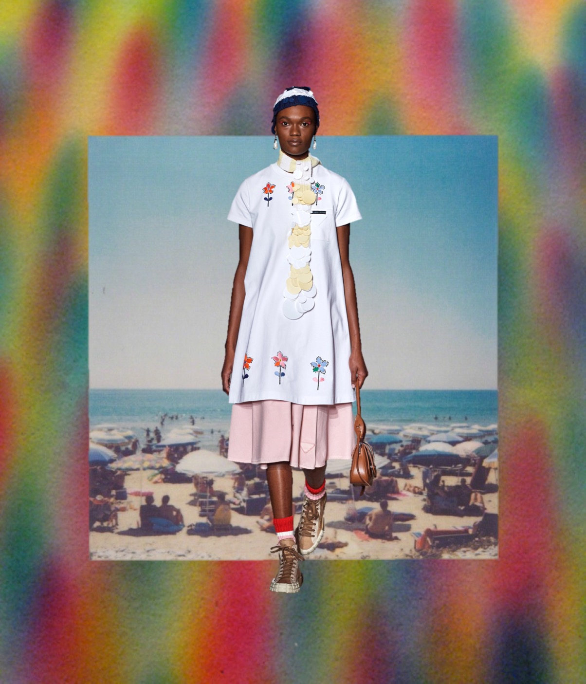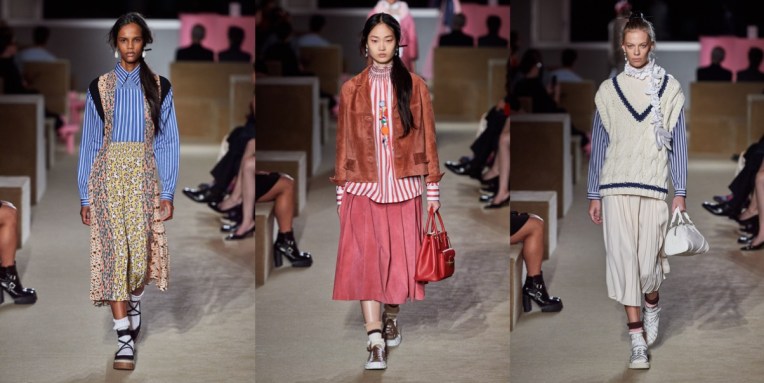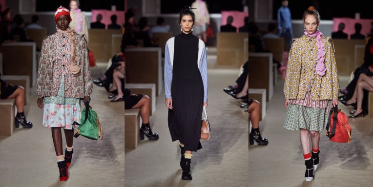 Retro florals, smart layering, scarves bejewelled with XXL sequins, baroque pearl earrings, chunky hand-knit tennis vests, clashed prints. Carefree eclecticism that isn’t overly extravagant, but daringly fantastic for everyday. It seemed that Miuccia Prada resorted to simpler, easier codes of fashion, leaving the darkness of last season behind. But in a way, this was Prada’s defiance in the time of difficulties. The collection, staged in New York (just like last year), was pure joy, whether we’re speaking of a blue peasant shirt-dress with naive flower embroideries worn by Freja Beha or adorable, knitted striped beanies and socks in bold colours, paired with the most ‘unmatching’ looks. There were also looks that will comfort the safer Prada customers, like light, loosely tailored blazers and classic coats. For me, what stood out in this collection, was the number of possibilities, suited for many different personalities. While the last few collections from Prada had those two or three key looks that ruled the runway, and had a tendency to be polarised between super feminine and super dark, here the designer really emphasised that sort of off-the-fashion-show reality. Take what you love, mix it the way you feel like.