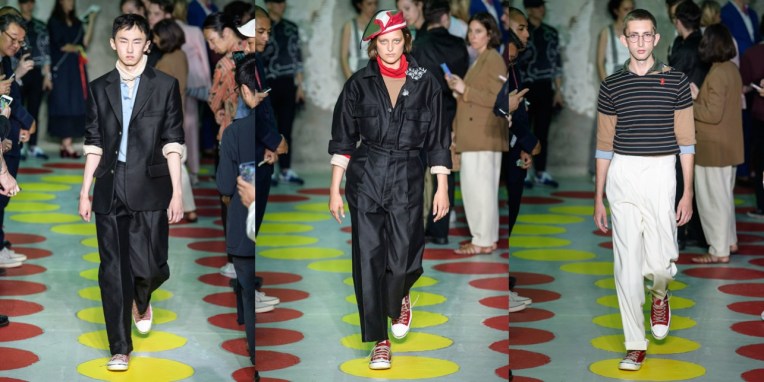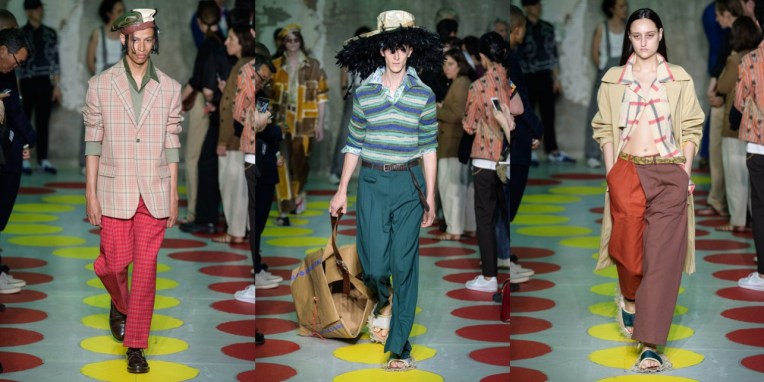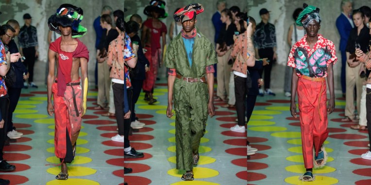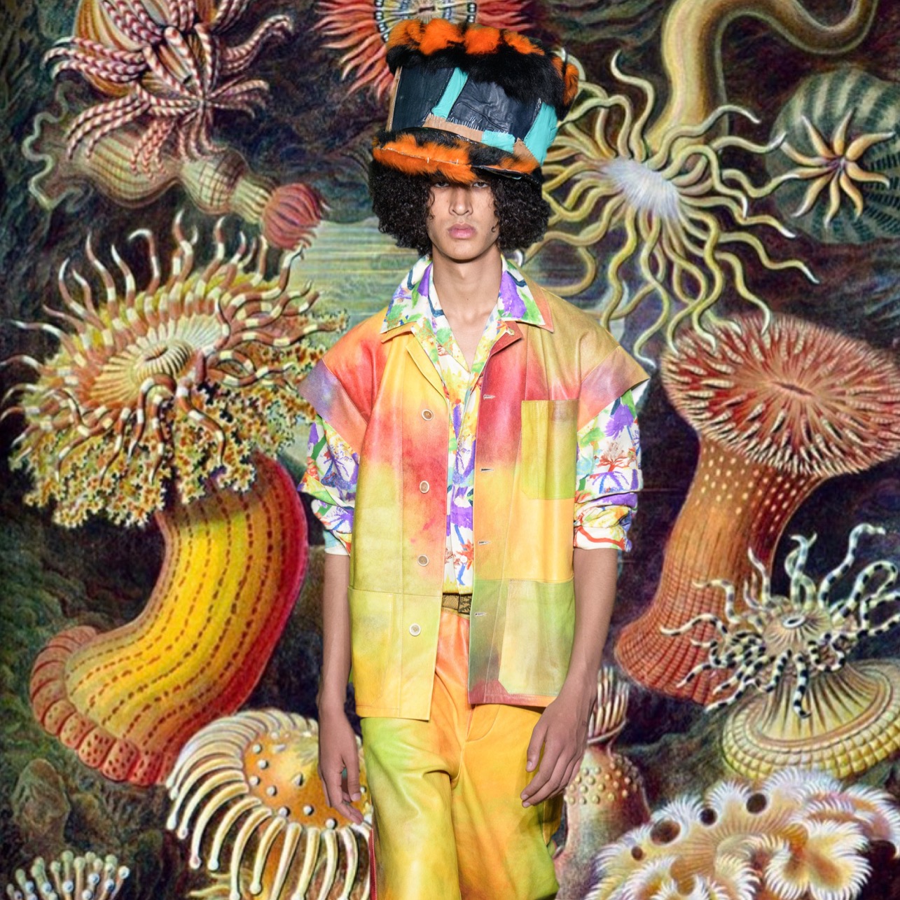 Francesco Risso moved big topics in his spring-summer 2020 collection for Marni, but in his typical, poetic, metaphor-filled manner. A fishnet was hovering about the guests’ heads, full of plastic debris collected from the oceans and from waste. Called Act1, the show was a conscious approach to engage in a deeper conversation on ethical values and a sustainable fashion practice: “We are here today to confirm our position in the world and to move towards action,” said Risso. “Let’s be vocal about our beliefs.“The designer has been implementing sustainable thinking into the brand for the last few seasons, but this really was a statement that hopefully will bud into real consciousness at the Italian brand. Even though you could expect exhausted eco warriors walk down the runway, Risso sent down a line-up of looks that sparked joy. It was a marriage of Truman Capote and Ernesto Che Guevara, beauty and rebellion. Marni’s rebels wore fabulous, crazy ritual totem-hats, made by artist Shalva Nikvashvili outof stuff that could have been easily thrown away to the trash: scraps of paper, feathers, plastic, fur, leather. The clothes as well had sustainable origin, to some extent. They had a sense of carefreeness, but weren’t ridiculousor clown-ish. Safari suitsweresplashed with brushstrokes, and cashmere and alpacas were patchworked with plastic and brocades. It all blended into a rather non-chalantly elegant,layered wardrobethat would be the fitting uniform for the Truman and the Che in an ideallypeaceful, eco-utopia.But you know what? I can equally see those clothes being worn in real life.