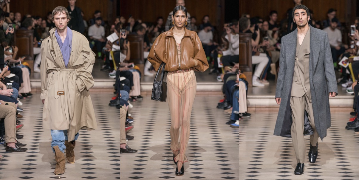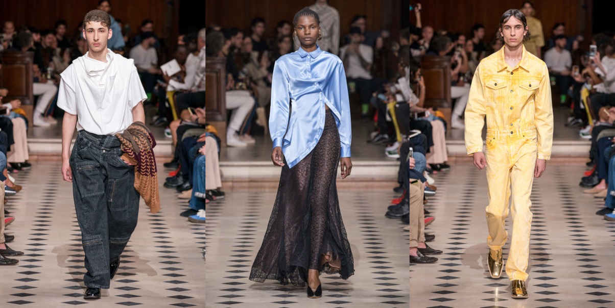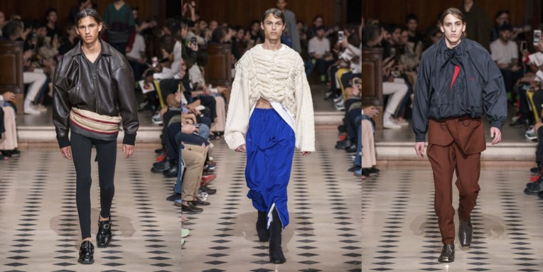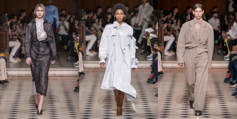 Glenn Martens loves distorting volumes at Y/Project, and it’s an in-house signature coming each season from the brand. But this season, twisting, elongating, bending and deforming proportions of garments resulted in flowing, organic, even beautiful silhouettes. The tailored jackets and coats were turned inside on themselves. Chevron stitching on knits pointed downward past the double-zippered fanny packs to the super tightly fitted leggings below. Country wax and workwear jackets seemed to be violently grabbed at the collar and pulled upward. It’s quite incredible what Martens and his team do to their clothes, they sort of defeat physics. Womenswear was as well rotating around a similar idea of self-mutating garments, but it really surprised in case of fabrics that were used. Would you ever think of lace at Y/Project? The over-sized, black button-down dress worn over a beige shirt made of the same lace reminded me of Prada autumn-winter 2008, where Miuccia as well layered lace. But of course in a whole different way… Y/Project doesn’t stop to excite.