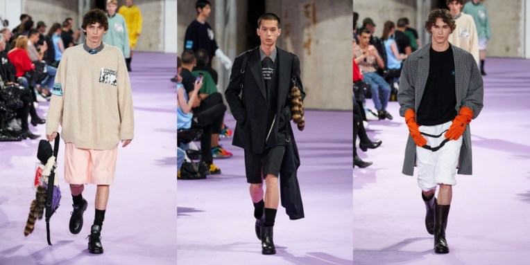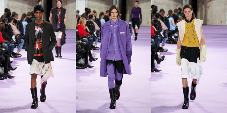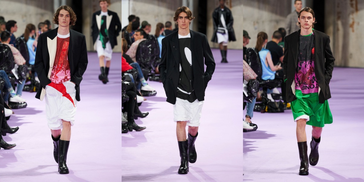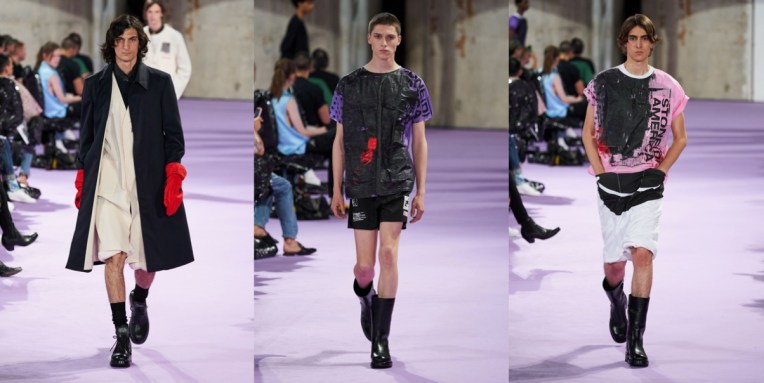 Corporate chairs, violently covered with black tape, were placed all over the show venue. “Big lie… media America, corporate America… fascist America” spoke the mysterious voice as part of the soundtrack. Was Raf Simons about to sent down a line-up of corporate killers? It rather seemed like an underground tribe of rebellious boys who were about to fight with the old, power-holding white men, who block individuality. From one side, you could perceive this collection as Simons’ comeback to his comfort zone: defiant teenagers in rage. But from the other side, this might have been a cumulation of feelings gathered after the designer’s abrupt exit from Calvin Klein, which happened nearly a year ago. Today, Raf is again his own boss, and he’s sure of one thing: he despises corporate, capitalist America. “STONE(E)D AMERICA” sign appeared on a number of garments, while the hospital gowns and coats had “RS-LAB” labels on. The t-shirts were splattered with red paint, the knits were ripped, shorts were styled with heavy boots (as if the boys were off for a long crusade). Some models wore red scientist gloves – maybe Simons nodded to handling radioactive chemicals in this dystopian vision? This was a collection with a message, with emotions, but simultaneously is full of deadly good clothes. Raf doesn’t dissapoint.