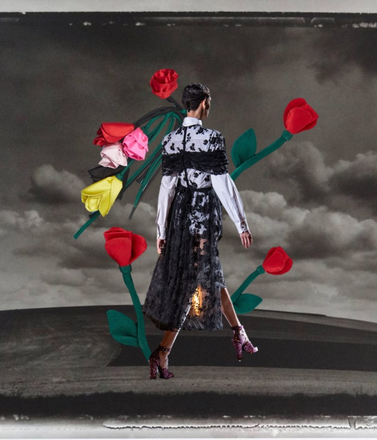 “What Prada’s autumn-winter 2019 was like? Rebellious and romantic, dark and light, aggressive and soft. An entire anatomy of feelings and moods, masterfully presented through fashion. Miuccia Prada sent down a line-up of big, heavy boots mixed with ultra-feminine touches, like draped silk roses stuck on skirts and bags, rich crystal embellishments and very sensual cuts that made each of the wool black dresses a true show-stopper. Just like in this season’s menswear, Prada featured Frankenstein-inspired prints (specifically the film still motif of Elsa Lanchester and Boris Karloff in the 1935 movie ‘The Bride of Frankenstein’) and following her current mood for cult horrors, some of the models had literal Wednesday Addams’ braids. There was the usual clash between utility (this time it felt even military, noting all of the khakis and uniform silhouettes) and delicacy (classical, black lace appeared dozens of times, whether layered on Prada’s signature nylon or as see-through knee-length skirts and dresses). Quite visibly, Miuccia’s woman is full of contrasts, just like each of the looks that went down the runway: there’s tenderness, there’s fragility, but there’s toughness and assertiveness. Mrs. Prada is a genius – but that fact is nothing new.” More here.
