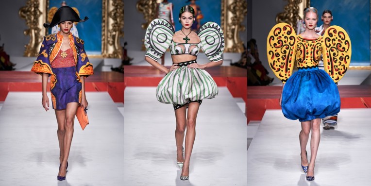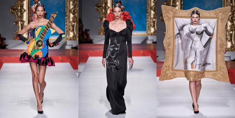 I still can’t believe that I’m writing about Jeremy Scott‘s Moschino. But his camp-y, silly, fun spring-summer 2020 collection just can’t be ignored. It was just as good as Franco Moscino’s Moschino. In a spectacle of art in motion, Scott’s line-up saw Pablo Picasso’s paintings reimagined as structured cocktail dresses. The designer drew on the iconography of the artist, transforming his best known motifs into theatrical, exaggerated garments – a dress adorned with a Cubist guitar, blouses with big shoulders that were flattened into two dimensions – that really, really amaze. Models emerged through a carved gilt frame, and even wore a wide, boxy dress version, its edges embroidered to three dimensions with gold thread and filled with a canvas of a Cubist nude that covered the model’s body. “Artists inspire the world” – this was Jeremy’s thought behind the collection. They really do.