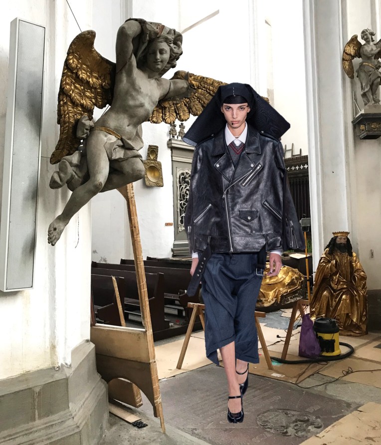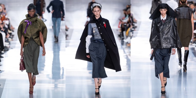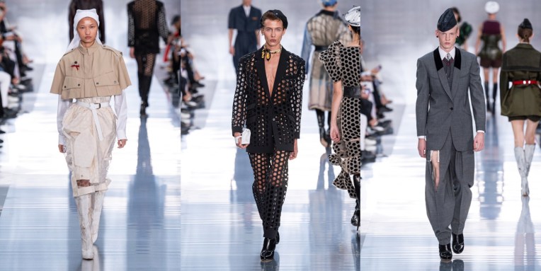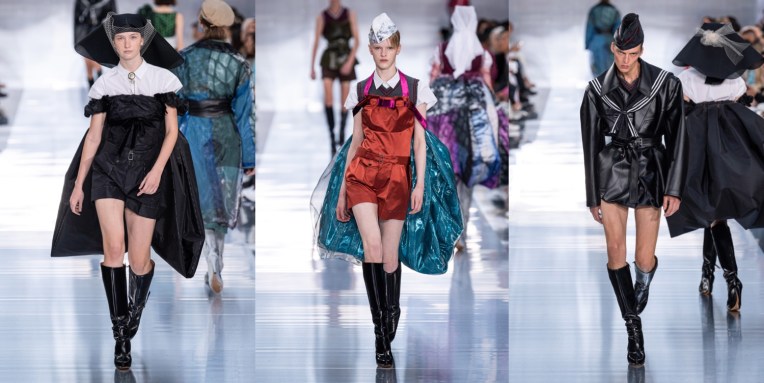 At Maison Margiela, John Galliano once again reflects on the digital age, with an exploration of hope, heroines and liberation in the face of “the chaotic noise of the social media debris“. Also, this was one of the most deep collections in a while coming under the Margiela label. Galliano is British, and Brexit is a topic that moves him personally. One of the slogans frequently voiced by the right is that British independence is “what we fought for in the war” – a false, trigger phrase which ignores the fact that the fight was against the forces of fascism in Europe. His spring-summer 2020 collection was a timely salute to the ordinary young men and women – the nurses and airmen, the army and navy boys – who stepped up to win the victory against Nazism in alliance with the French Resistance in occupied France. “Reverence for the lessons of history and what they taught us,” read a thought line in his press release. “Stories of hope, heroines, and liberation are forgotten as history draws ever closer to repetition.” This couldn’t be put together in a better way, really. First look: a navy cape, white hospital sleeves, and a gray serge pencil skirt. Second, a model in a black dress with a veiled hat trimmed with a feather, inspired by the the 1930s or 1940s (probably a nod to the Frenchwomen of the Resistance who went about their undercover work carrying secrets and explosives in their). Galliano as well turned to exploring uniform – of course in his non-chalant, experimental manner. Other than a traditional white mackintosh coat or eclectic jewellery made out of military stripes, pins and medals, there is plenty to be proud of in heritage, Galliano seemed to be saying in this collection, but that as well includes the right to freedom of self-expression, (inclusive of defending the LGBTQ+ rights that have been enshrined and respected by law since Europe has been united – well, mostly everywhere). However, please note that the collection wasn’t heavy with history; it wasn’t all serious and solemn. It was fun and dramatic; it was a celebration of male eroticism with a clubbing twist (have you seen Leon Dame’s finale walk?); it felt spontaneous, even though it wasn’t.