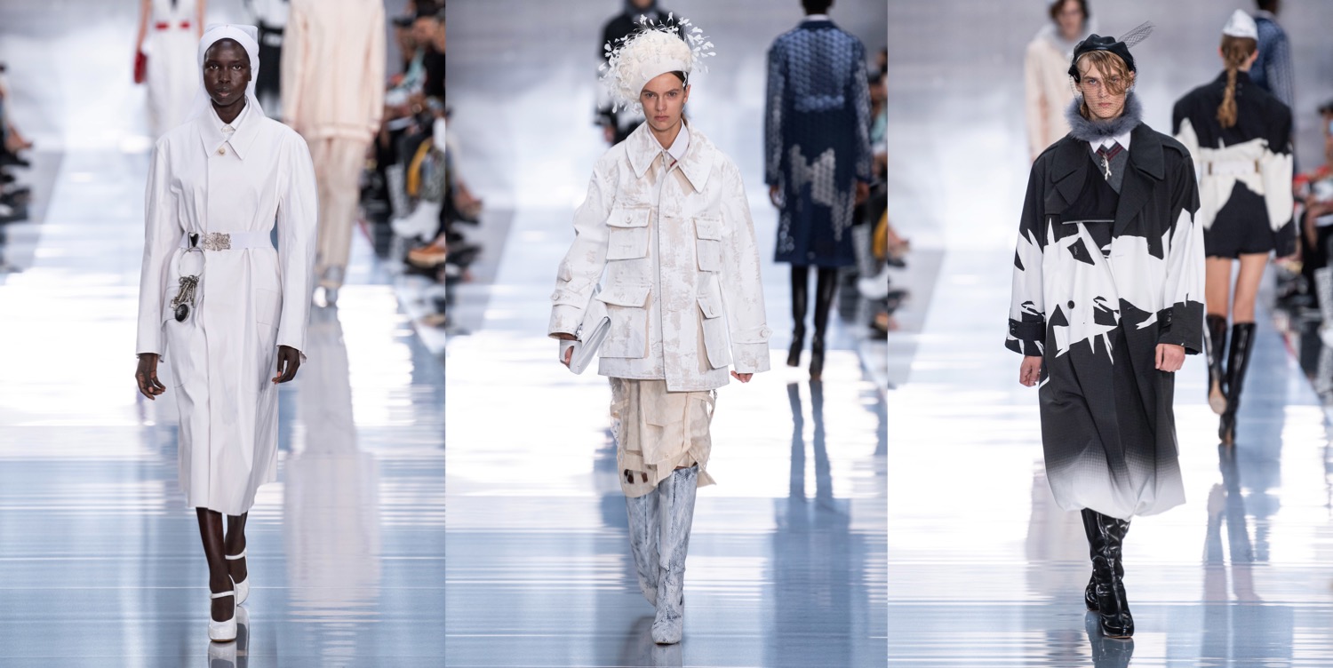 At Maison Margiela, John Galliano once again reflects on the digital age, with an exploration of hope, heroines and liberation in the face of “the chaotic noise of the social media debris“. Also, this was one of the most deep collections in a while coming under the Margiela label. Galliano is British, and Brexit is a topic that moves him personally. One of the slogans frequently voiced by the right is that British independence is “what we fought for in the war” – a false, trigger phrase which ignores the fact that the fight was against the forces of fascism in Europe. His spring-summer 2020 collection was a timely salute to the ordinary young men and women – the nurses and airmen, the army and navy boys – who stepped up to win the victory against Nazism in alliance with the French Resistance in occupied France. “Reverence for the lessons of history and what they taught us,” read a thought line in his press release. “Stories of hope, heroines, and liberation are forgotten as history draws ever closer to repetition.” This couldn’t be put together in a better way, really. First look: a navy cape, white hospital sleeves, and a gray serge pencil skirt. Second, a model in a black dress with a veiled hat trimmed with a feather, inspired by the the 1930s or 1940s (probably a nod to the Frenchwomen of the Resistance who went about their undercover work carrying secrets and explosives in their). Galliano as well turned to exploring uniform – of course in his non-chalant, experimental manner. Other than a traditional white mackintosh coat or eclectic jewellery made out of military stripes, pins and medals, there is plenty to be proud of in heritage, Galliano seemed to be saying in this collection, but that as well includes the right to freedom of self-expression, (inclusive of defending the LGBTQ+ rights that have been enshrined and respected by law since Europe has been united – well, mostly everywhere). However, please note that the collection wasn’t heavy with history; it wasn’t all serious and solemn. It was fun and dramatic; it was a celebration of male eroticism with a clubbing twist (have you seen Leon Dame’s finale walk?); it felt spontaneous, even though it wasn’t.