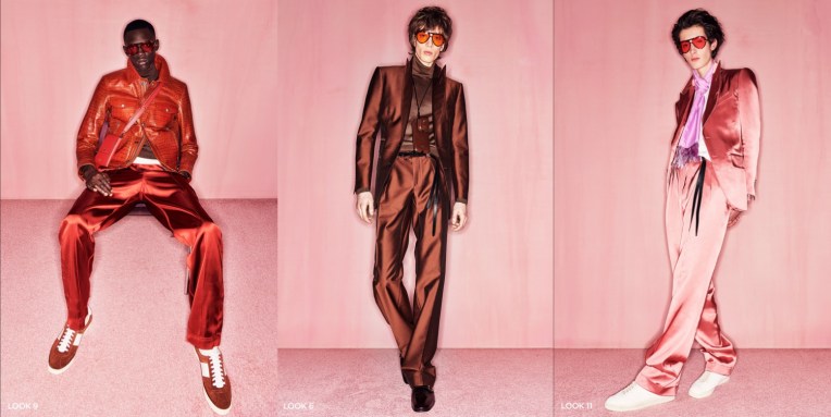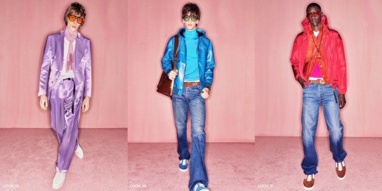 As told by Tom Ford’s team at his Milan showroom, when the designer was making his name at Gucci in the latter-half of the 1990s, he had a routine when it came to pants. Apparently Ford would loop a strip of leather through the two front belt-loops either side of his fly and knot them to ensure a just-so fit. For autumn-winter 2020, Ford offers his pant-tie – now called an Obi – that was incorporated into the kicky iron-creased pants that accompanied his attractive jackets. The looks is non-chalant, yet at ease. These suits came in a multitude of hues and fabrications – like gently washed denim or the incredible lilac satin(or the Madonna-Gucci-shirt-blue!). When shorn of a matching jacket the pant shape in denim looked as if taken straight from the 90s. Summing up, Ford’s wardrobe is super hot this season.