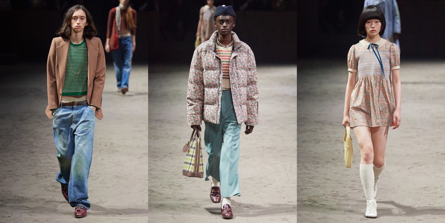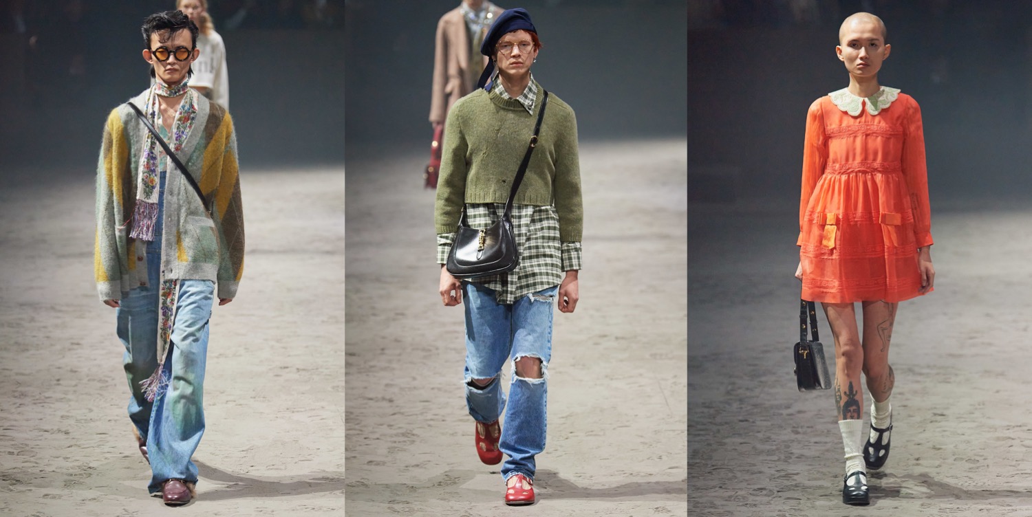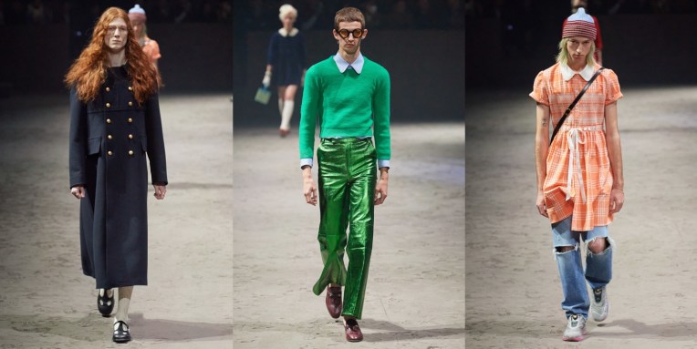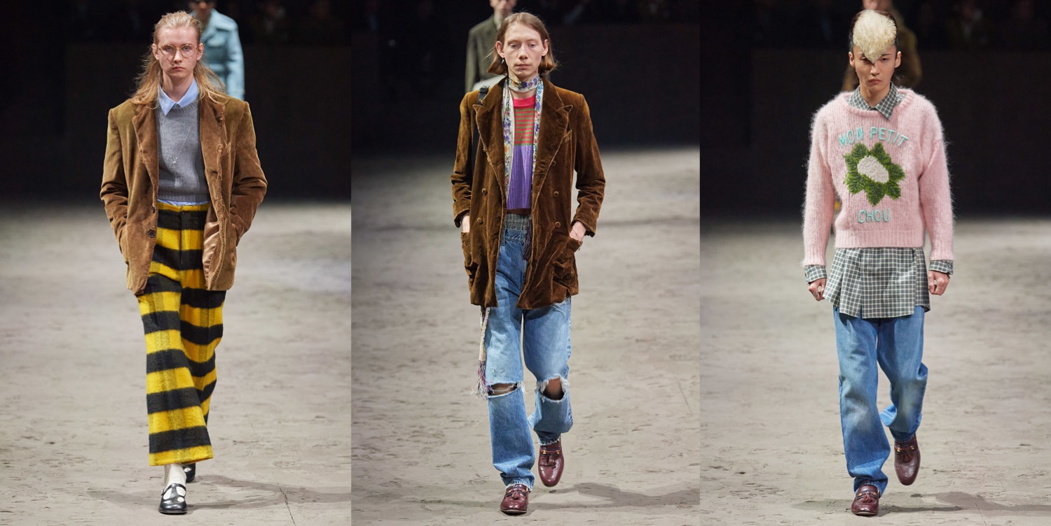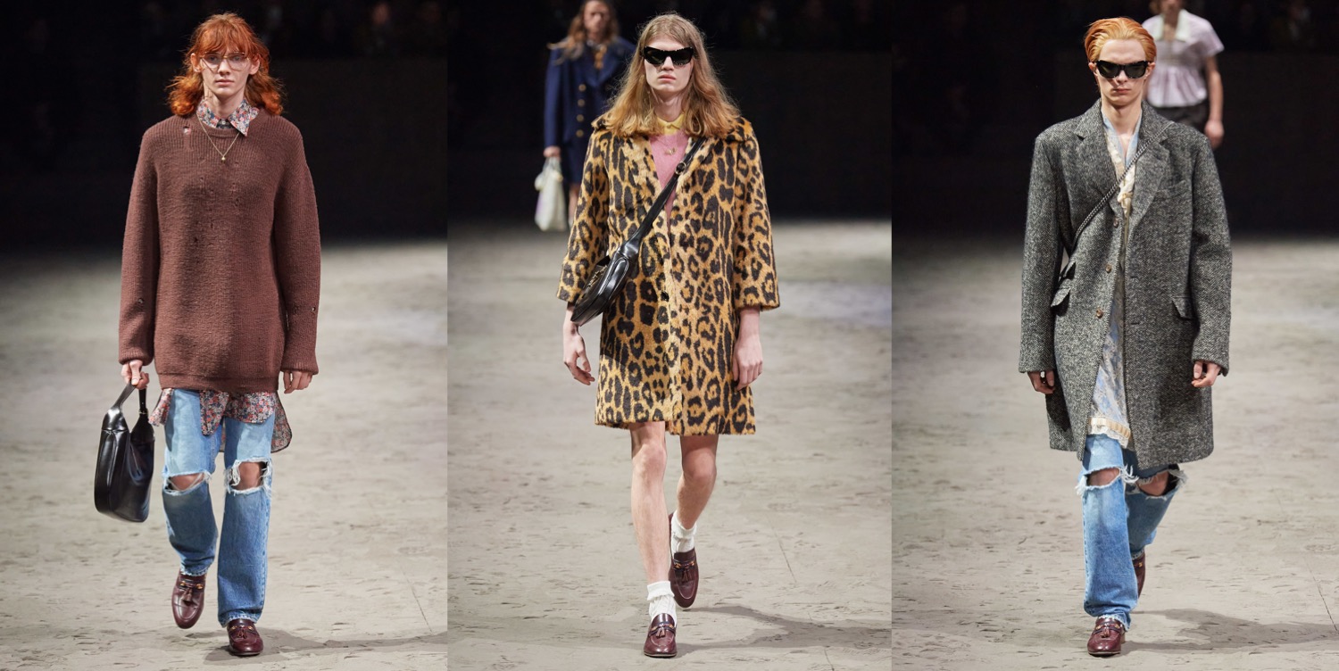 A huge pendulum ticktocked back and forth, drawing a line in the sand beneath it. The mood felt far more sober that usual. Time for reflection? “Fashion is a sort of clock,” Alessando Michele rightly observed after his Gucci autumn-winter 2020 collection for men. Michele’s very first show – of a collection assembled in only five days after Frida Gianini’s abrupt departure – was held at the Milan menswear week in January 2015. And who would have thought it’s impact will be this big – not only for Gucci, but fashion in general? Michele referred back to that first collection – the open-back kangaroo-lined loafers that were his first big accessories hit were among the footwear in the new collection. But this was not self-reference for the sake of it. “I haven’t got any nostalgia,” he said. “I don’t cling to the past…. I use the past because the past is a very interesting space.” Grannyish knits and David Bowie-ish metallic flares, Kurt Cobain-ish grungy ’90s denim and a Courtney Love-ish leopard-print coat. Those were the first references that came to mind. And the tongue-in-cheek title of the show – ‘Rave Like You Are Five’? Most of the clothes were styled the way children wear their clothes when parents aren’t around: the way they like, not the way they areobliged to. Michele was also exploring the big idea of the season: an emphasis on the potential boundarylessness of masculinity rather than its long-constructed boundaries. “This is not a narrative that excludes or rules out mainstream masculinity; on the contrary, I want to talk about how complex it is to be a man. And this means growing up maybe in a different way because the world of men is very diverse and full of different elements like the feminine world.” But what I enjoyed the most in this collection was the lack of the Gucci-fied over-the-topness (which the designer signalised for the first time in his spring-summer 2020 line-up). Without all the drowning opulence that Michele made us used to in the last couple of years, you really feel and see his pure aesthetic.