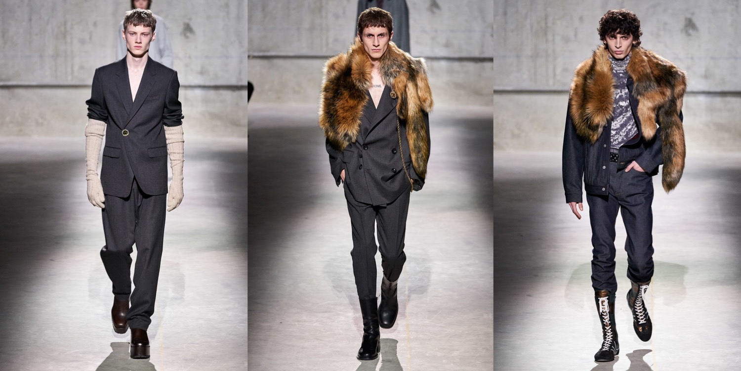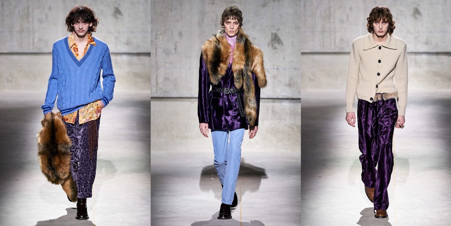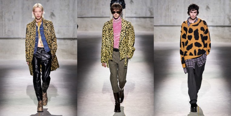 Dries Van Noten‘s latest fashion is fire hot. First the Christian Lacroix collaboration that became an instant, historic moment. Now the autumn-winter 2020 collection for men, which is just wild. “It’s about enjoying clothes, dressing: using your sexual power to feel great.” Faux fur stoles (aaaaaaaah, the return of decadent chic!), rich velvets and satins, leopard prints, raw denim, chunky knits. The collection was rock & roll, Mick Jagger, New York Dolls, so many things. There were also a lot of loose silk pants and to a lesser extent shirting, the sensual mellifluousness of whose material wafted breathily against the stronger, harder pieces around them. The collection as well included many menswear classics. The military bomber and parka, the long check overcoats and the burnished brown leather jacket were all hot stuff for outerwear lovers. Hawaiian-style prints on puffers, shirting, shorts, and pants, plus typically vibrant knits completed a collection that climaxed with some crystal-set lilac silk boxing shorts and a rush of rave applause. This mights be favourite collection of the entire menswear season.