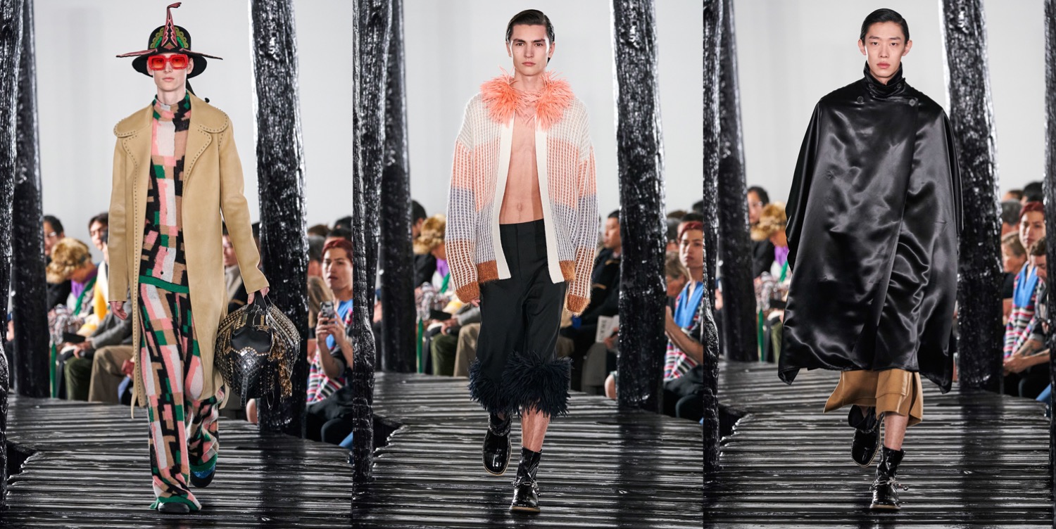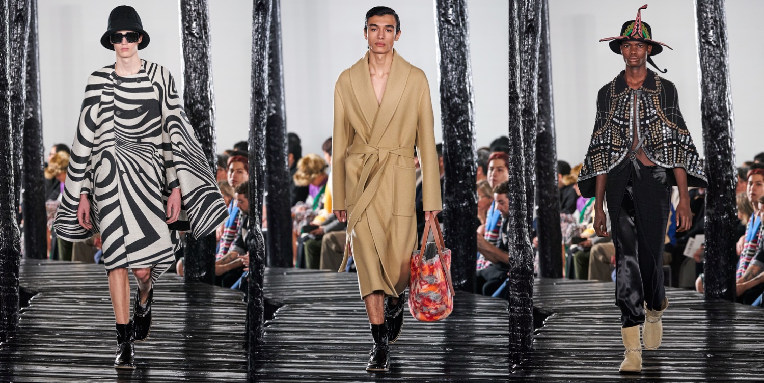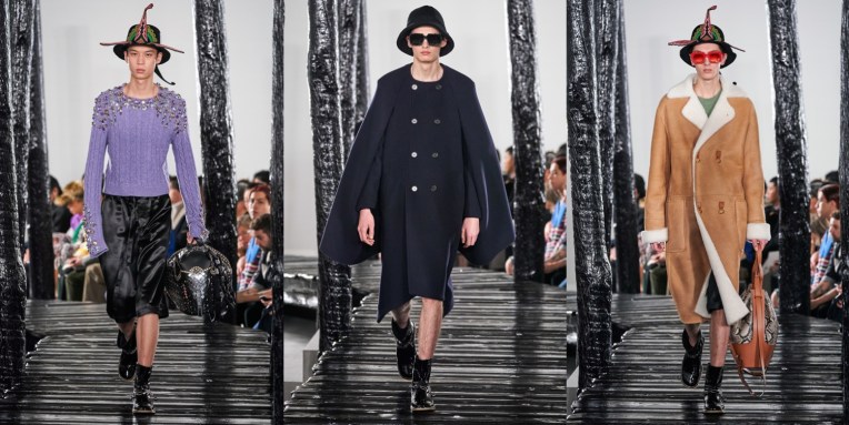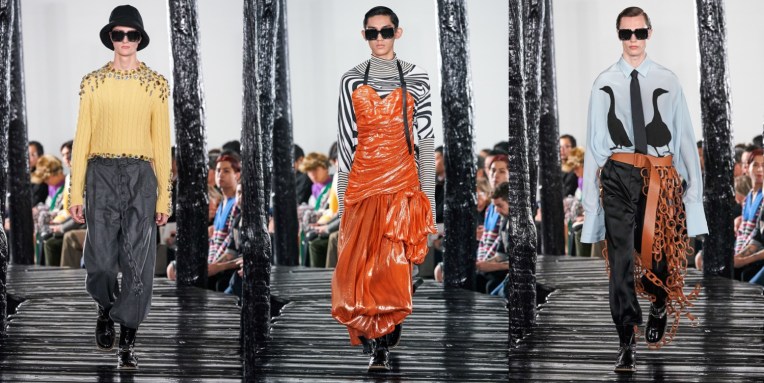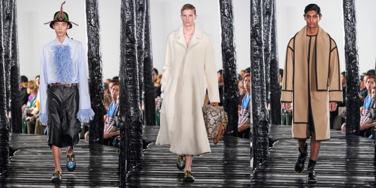 At Loewe, things took a fun twist. That gesture of holding something in front of the mirror to see how it looks – we all know it. You could just see it the boys wearing draped lamé dresses fixed to the front of their tailored outfits on the autumn-winter 2020 runway. “I was thinking of ’50s couture—and a child, trying something on. What do you look like in the mirror?”, Jonathan Anderson explained. The two themes which have been running through this menswear season were bound together in one collection: carefree boyhood and the unprecedented presence of ideas about haute couture in menswear. “A fantasy wardrobe,” Anderson called it. “Playful. Optimistic. Pretty boys.” The dresses were a kind of signifying accessory, attached, apron-like, with leather straps. They said a lot about the way Anderson has always worked in the studio, experimenting with garments in free-association. The designer also put guys in coats which had “couture structures, on a woman’s block.” There was a white fit-and-flare shearling, a high-waisted princess-line coat. The zebra-print double-breasted caped silhouette, Anderson imagined, could easily become a superhero look. The childlike-couture perspective (also big at Francesco Risso’s Marni) led him to blow up existing Loewe mini-leather goods’ elephant shapes to become oversized tote-toys, to sprinkle crystal bling on sweaters, dangle diamanté jewelry on black patent boots, to weave a coat-dress from floral-print scarves. Anderson pointed out his own favorite—a shirt appliquéd with a pair of geese. Random and eclectic, don’t care. The point is that everyone, gender-regardless is welcome to pick and choose from what Anderson designs and delivers at Loewe.
