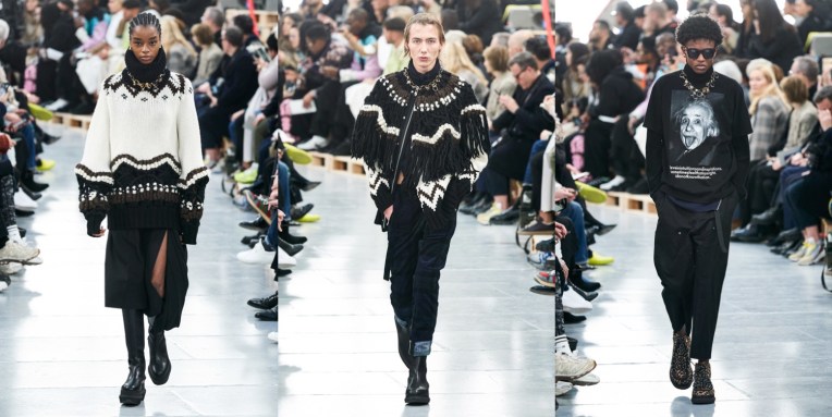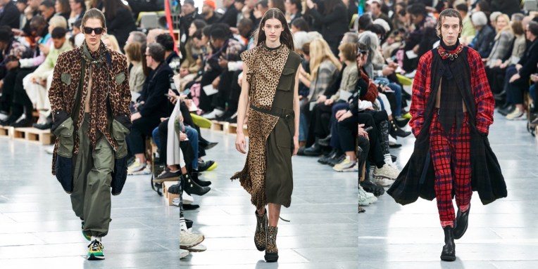 Chitose Abe doesn’t have a formula for her signature hybrids; it’s mainly intuition, she insisted after her autumn-winter 2020 men’s Sacai show (and women’s pre-fall 2020 presentation). It turns out that the man who invented what is arguably the world’s most famous and universal formula, E=mc², was also a big believer in intuition, so Abe made his words her latest motto (and the line-up’s t-shirt that will sell like hot buns). Saca and Einstein is a genius remix. Backstage, she was wearing a T-shirt that read “common sense is the collection of prejudices acquired by age 18” – a quote commonly attributed to him. In her work, Chitose allows an arbitrary inspiration to motivate a shift in layers and volumes or a shakeup in color or pattern; but you don’t get the sense she sets out to radically alter her repertoire. Instead, she experiments, innovates and taps into a topical subject or feeling. This began with women’s looks consisting of suit jackets counterintuitively worn atop military layers that gave way to a fluid skirt and punk-ish platform boots. The men’s outfits included a few Mod-inflected ensembles, sweaters that unzipped up the torso and total looks in pink that corresponded to the romantic spirit of the season. Across both collections, the usual toggling of utility and fluidity played out in animal spots and cosmic-themed bandana sketches by the tattoo artist Dr. Woo. Elsewhere, Abe relied on denim, tweed, tartan, and fleece. A goodie!