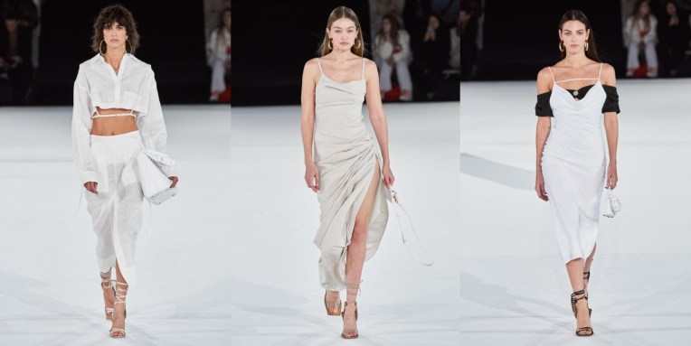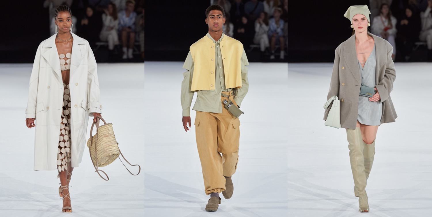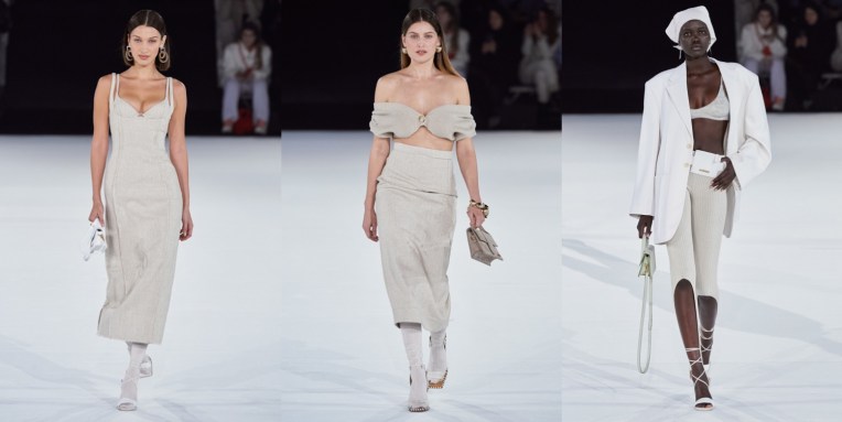 Last season‘s Provençal dream is hard to beat. So, in a way, Simon Porte Jacquemus didn’t intend to make his autumn-winter 2020 even more extraordinary and Instagrammable. Not meaning it was modest or small – showing at La Defense stadium with Laetitia Casta, the Hadids and a pack of supermodels isn’t really a quiet gesture. But design-wise, Jacquemus returned to the core of his style: it’s sleeker, cleaner, less quirky, toned (except for the brief splash of bold pink). And incredibly sexy (without being vulgar): the body-conscious fit, cropped cardigans, wrapped micro-skirts, thigh-high boots are just some of the “hot” piece. Guys followed girls in pants, which appeared to have their flies open (a trompe l’oeil). There were oversized blazers and roomy coats for both women and men, creating a sense of concealed sensuality. While we all got used to Jacquemus’ sun-drenched, French flavor, it’s good to see designers go out of their (already succesful) comfort zones. The backstory behind the collection was as personal and profound as it could be: “I was seven when I made a skirt out of a curtain for my mother, and she brought me to school wearing it.” The linen pencil skirt, which opened the show on Casta, was a personal memento of that, and the reason the fabric was an anchor for the collection. But business-wise, Porte Jacquemus realized that he could use his buying power to change things with his fabric manufacturer. “We’ve been working with them for 10 years, but they didn’t have a sustainable fabric that we wanted. Now, they do – because of the size of the order I can make. But you know,” he said with a smile, “what I want to say is, it isn’t just for ecology, it’s also people—their rhythm of work also has to have sense. I don’t say I’m a green brand or anything like that; it’s not marketing. But I think we have to think more like my grandparents did: like, we have tomatoes in the garden, so we eat tomatoes.” Wise words for the industry to consider.