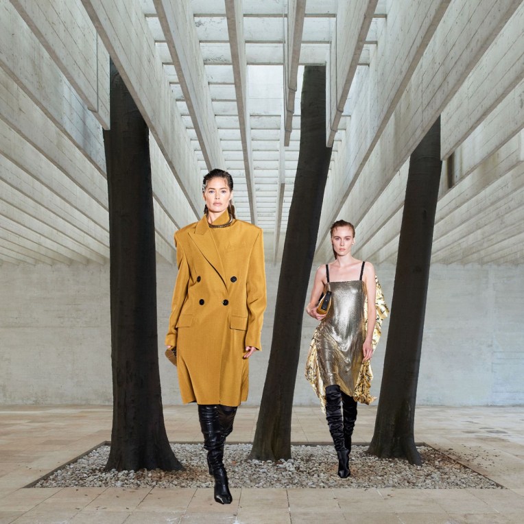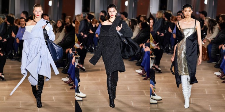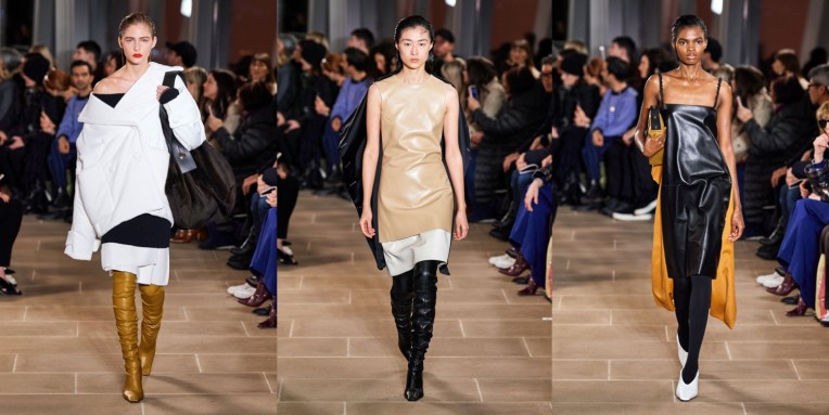 Something has shifted at Proenza Schouler. The last few seasons from Lazaro Hernandez and Jack McCollough weren’t their best, lets be honest – they were plain and mild, and seemed to drown in the New York fashion week crowd. But their autumn-winter 2020 collection feels different. Delicate silhouettes got replaced by sharper cuts, and instead of draped forms we’ve got something much more geometric and bold. Also, the lenghts are shorter, the mood isn’t slouchy. The first look was a little black dress slipping off the shoulder, worn with ruched leather boots. Later looks followed the same pattern of „undone” style: jackets and knits peeled off of one shoulder, stretch leather dresses were cut with asymmetrical necklines, and a cold shoulder sweater exposed both clavicles. The closing looks were all about comforting volume. The designers’ starting point was a blanket. The duo gave their stylist Camilla Nickerson one for Christmas which she started wearing as a scarf, and inspiration was born. “She’s blanketed in a protective layer of strength and confidence,” Hernandez said backstage. McCollough put it another way: “It’s about finding beauty in a world that’s unraveling.”