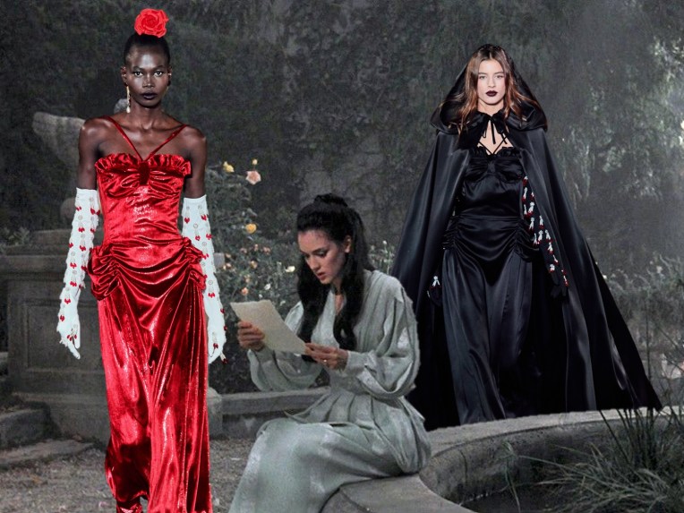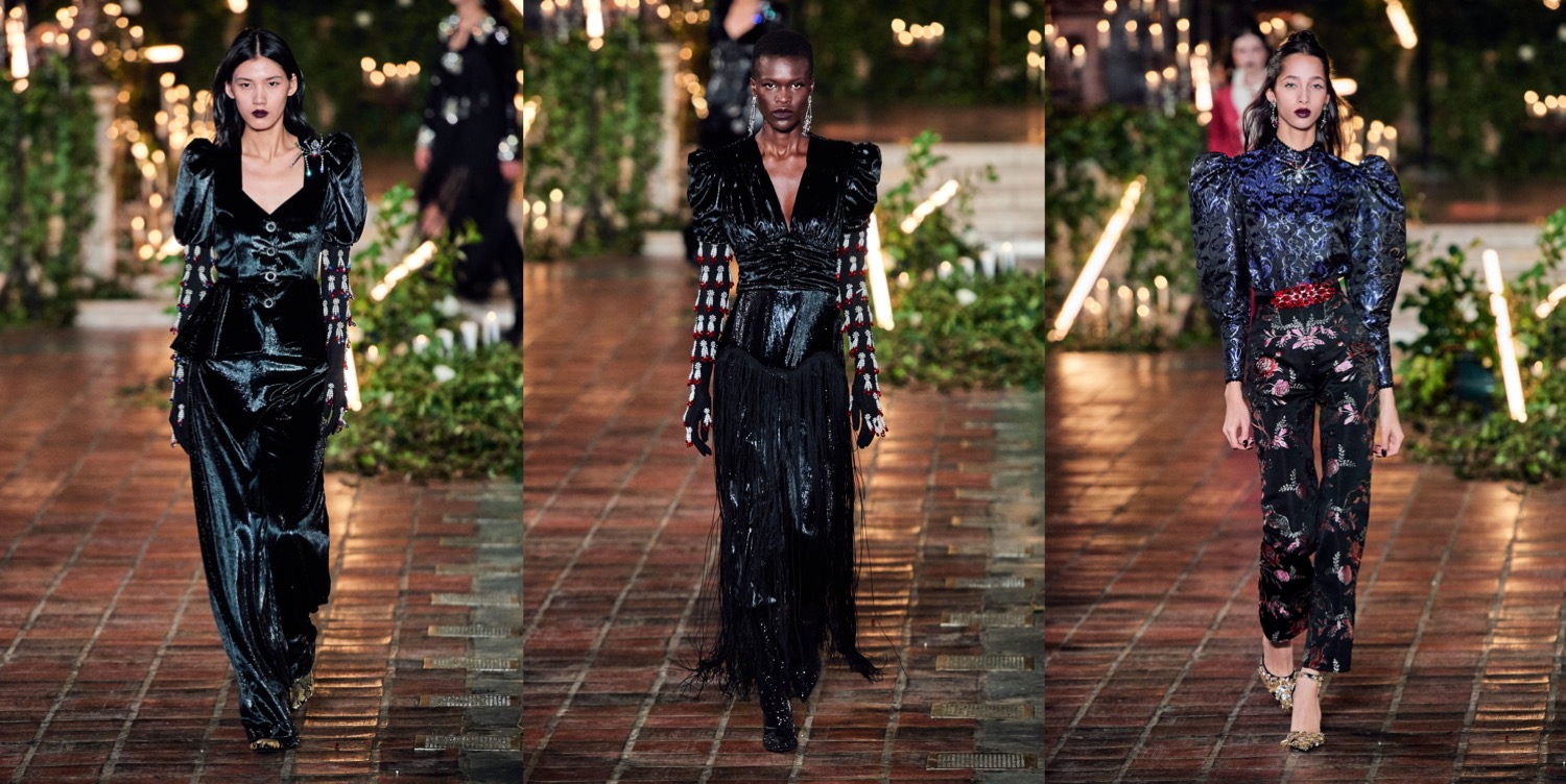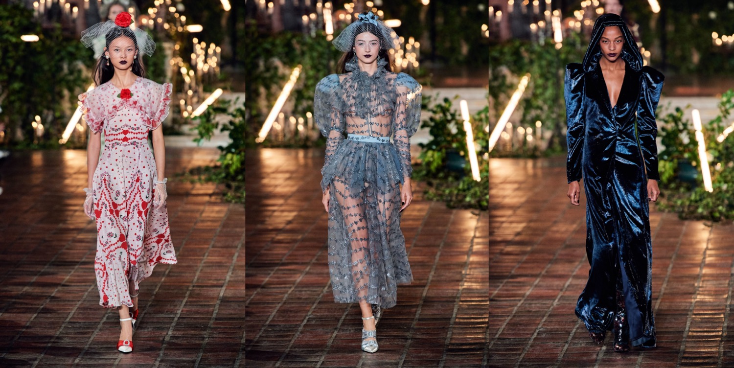 Bram Stoker’s 1897 novel „Dracula” inspired Francis Ford Coppola’s cult 1992 adaptation of the book, starring Winona Ryderand Keanu Reeves and featuring costumes by the legendary Eiko Ishioka. Kate and Laura Mulleavy’s autumn-winter 2020 Rodarte collection riffed on Coppola’s movie (and Ishioka’s costumes), but the result wasn’t a literal, gothic line-up. The location of the show – the dimly lit St. Bartholomew’s church in New York’s Midtown – provided a mysterious stage as the Mulleavys sent their army of ethereally chic undead out. The first part of the collection was about the pretty prey of Dracula: think cheerful polka dot day dresses, all over-sequined looks, draped blouses and pouf sleeves which all elaborated on 1940s-inspired silhouettes. Suddenly, the collection doubled down on the sweetness. Things got seriously dark – a sparkly midnight blue hooded cape, black fringes that looked like the tendrils of witches’ hair, cobweb embellishments, blood red. It was about witnessing the transformation of prey into predator, which was exactly the point. The show’s closer: a dreamy gown with big shoulders, blue flowers and a floor-sweeping, liquid-like veil. The vampire’s bride? Or the queen of the immortals? Designers seem to avoid scenarios for their collections – the fear of falling into the cliché trap – but at Rodarte, story-telling always works well.