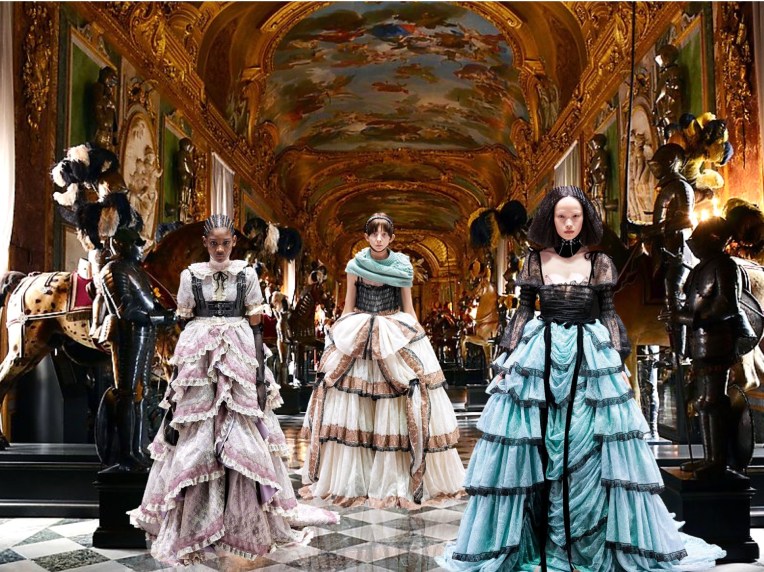 For a good start of Milan fashion week, at the very beginning of the Gucci show, the curtain was pulled back on the frenzied sort of preparations that typically happen backstage of any runway presentation. On a rotating carousel, bathrobe-clad models were quickly trussed and styled by fleets of dressers in gray Gucci smocks before taking their place along the stage’s edge. The vintage-feeling clothes, which included big hats and opera gloves, were no less theatrical – there were frilly baby-doll dresses, bell-bottom suits in pastels and baroquely ruffled ball gowns, inspired, said Gucci’s Alessandro Michele, by the idea of a mother dressing her child for a special occasion. What truly appealed to me in this show is Michele’s embrace of the dress-up ritual. It can be spontaneous, planned, conscious or unconscious, one day you can look like Janis Joplin, another be a goth lolita, and then on Friday be the S&M-version of Marie Antoinette. The opening look perfecly showed the theme of the collection: a confused-looking model in one of those gowns, with a chunky knitted sweater over her head.