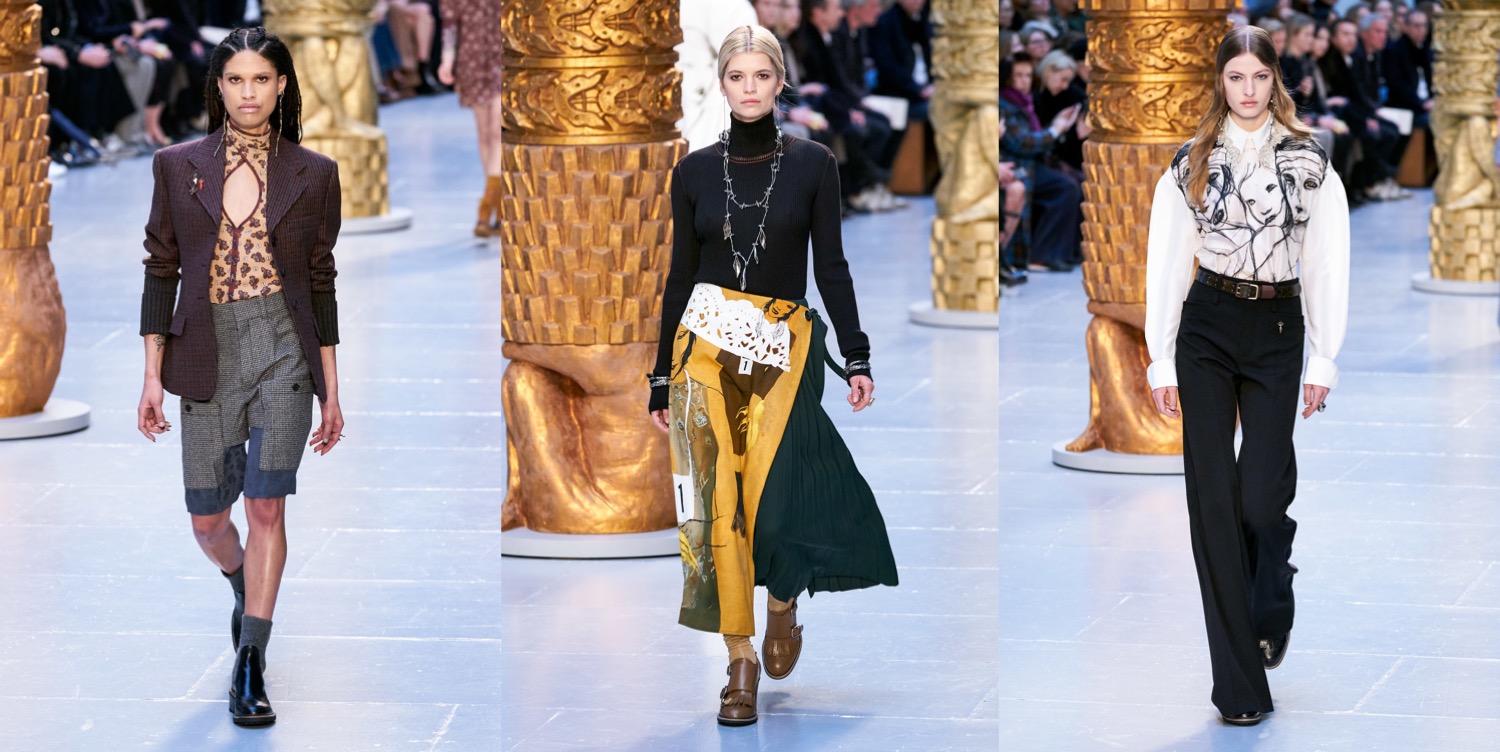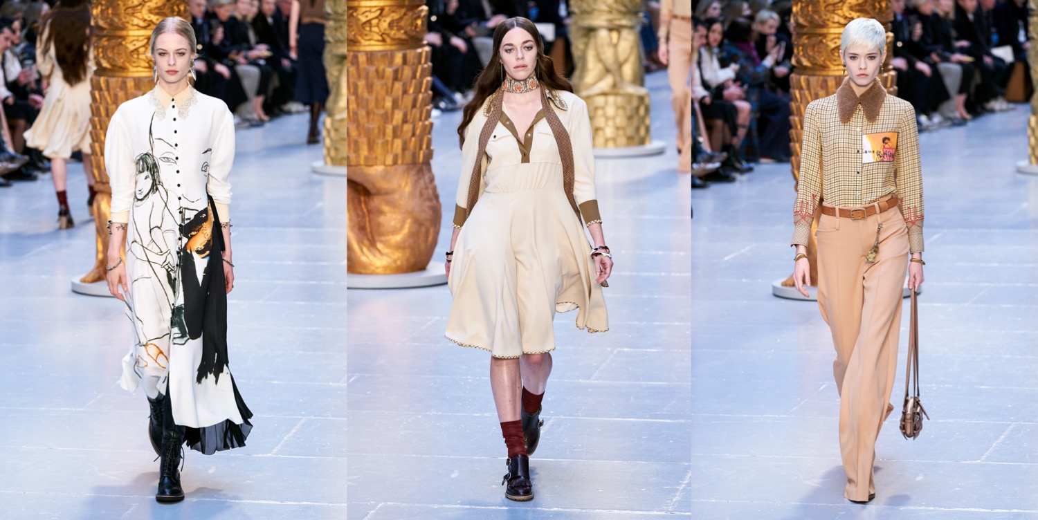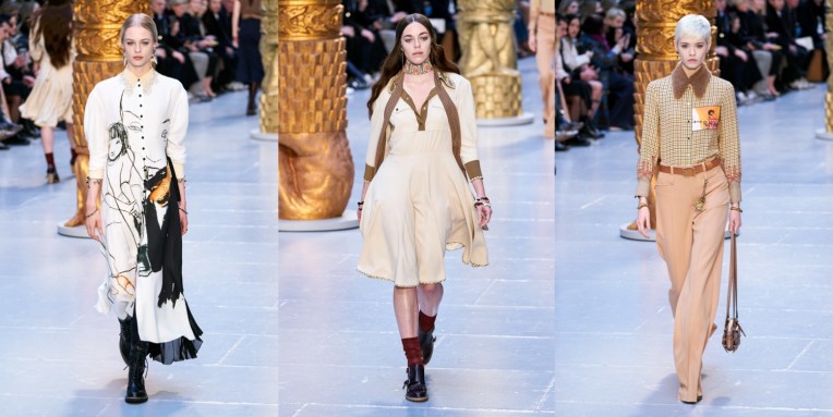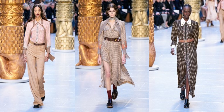 The Chloé invitation came with a mini poster of a Rita Ackermann painting. The artist provided access to five additional pieces from the ’90s and ’00s at Natacha Ramsay-Levi’s request, and the designer used them as patches on the front and back of a button-down shirt, as a design on a blanket shawl (Leave Me Alone, 1995), and as an actual-size print for a flowing shirtdress. Golden totem sculptures by Marion Verboom decorated the runway, and Marianne Faithfull smokily read Byron’s “She Walks in Beauty” and other poems on the soundtrack. Still more women creatives joined the models on the catwalk. “It’s about a community of creative spirits,” Ramsay-Levi stated. “Yes, clothes are great, but I love creative women.” After three years at the helm of the brand, Natacha accumulated her biggest Chloé signatures for autumn-winter 2020: the tailoring, the soft blouses, the romantic dresses. She infused them with personal touches that made them even more special. Suits leaned ’70s, with easy flaring pants and rolled-sleeve jackets. Her blouses had delicately jeweled buttons and cuff links, and her romantic dresses were alternately inset with bands of crochet at the hem or decorated with enamel embroidery at their peekaboo necklines. The Rita Ackermann prints worked their charm too. Natacha Ramsay-Levi is one of those “woman for women” designers, and since Phoebe Philo still hasn’t come back yet, she leads the pack.