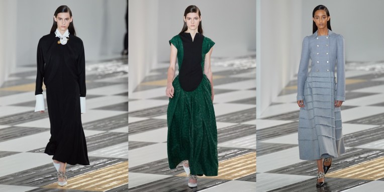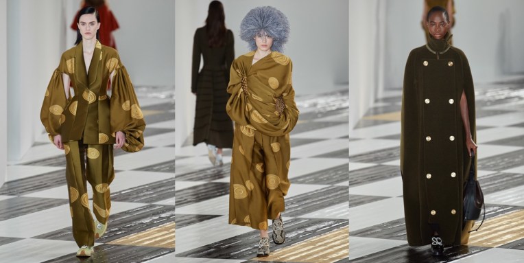 “Dressing to impress—I think that’s an exciting thing,” Jonathan Anderson declared backstage of his latest Loewe show. “Looking at building new types of silhouettes that can work in an abstract way. Trying to take a risk, maybe in my own self.” Taking risks is a trouble for many designers in Paris, so it’s great to see at least someone addressing that. What he began with – the volumized “entrance-making” shapes he showed in his JW Anderson collection in London – was followed through with inspirational conviction at Loewe. The collection at some points looked odd, but in a good, refreshing way. This line-up wasn’t obvious. What were these brocade dresses, gathered by Takuro Kuwata’s ceramic works? How to capture the shoulder-extending device from which caped-back sleeves were suspended? Anderson said he didn’t quite know exactly how he’d arrived at those ideas. “But sometimes it’s nice to feel vulnerable when you’re doing a collection – that you don’t know what the outcome is going to be before you start.” In pushing across the frontiers of the norm, Anderson relies partly on spontaneous curation. “Exaggerating by illusion” is one way he described the process. Yet the thing about Anderson is that his creative push is also part of his incredibly prescient long-term strategy to turn Loewe into what he’s called “a cultural brand” (he’s reconstructed it into a fashion home for the art-owning and gallery-going international clientele). This as well gets reflected in Jonathan’s fashion. Echoes of 17th century Spanish art – especially Zurburan and Velasquez – come in the subtle Spanish semiotics Anderson embeded in the collection. Maybe there was a hint of flamenco in the raw-edge tiers in a gray flannel coat and the triple-fluted sparkle-dusted sleeves of a ribbed-knit dress. But then, some of the dresses had volumes that made you think of medieval-wear we know from miniature illustrations.