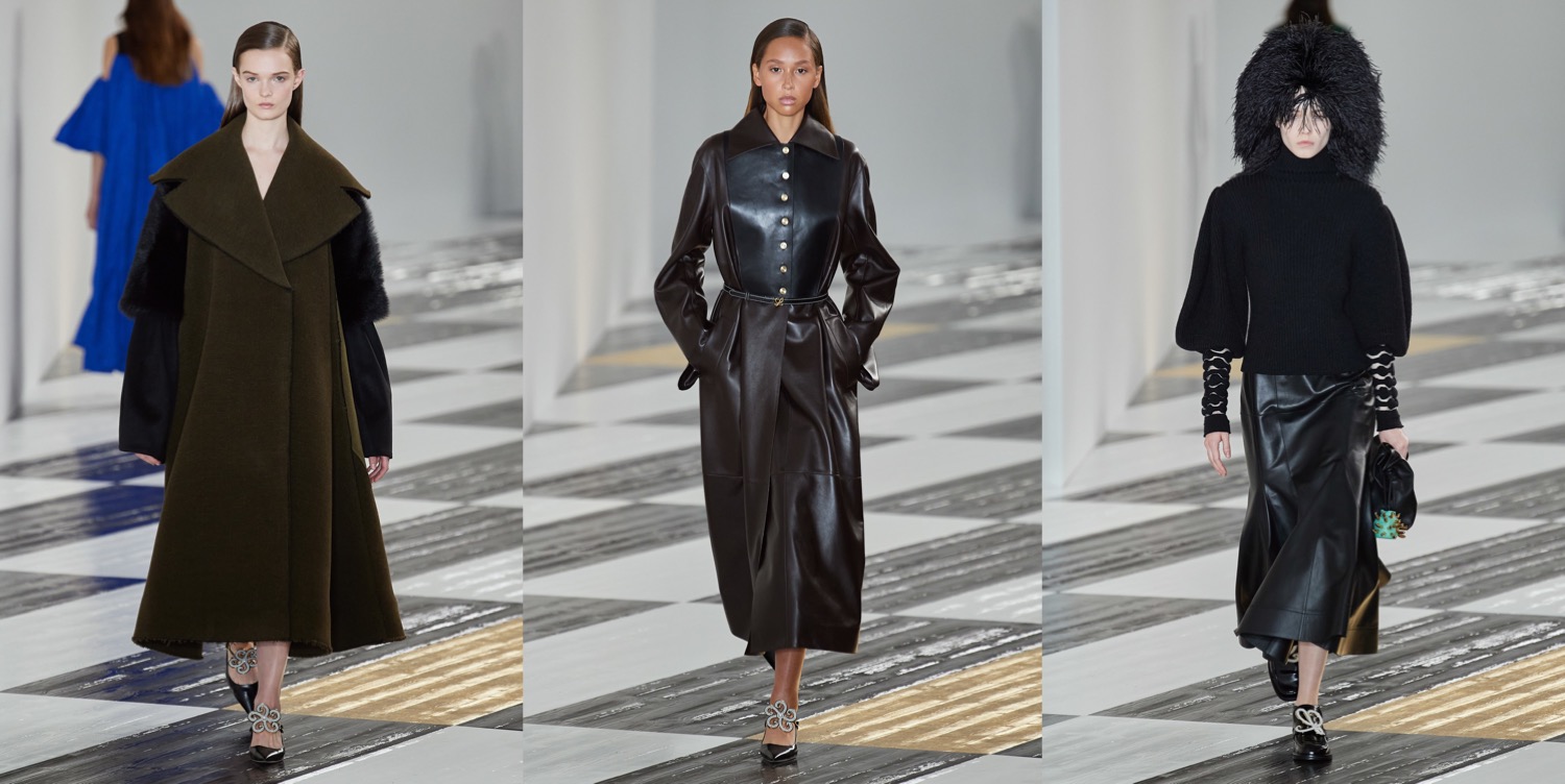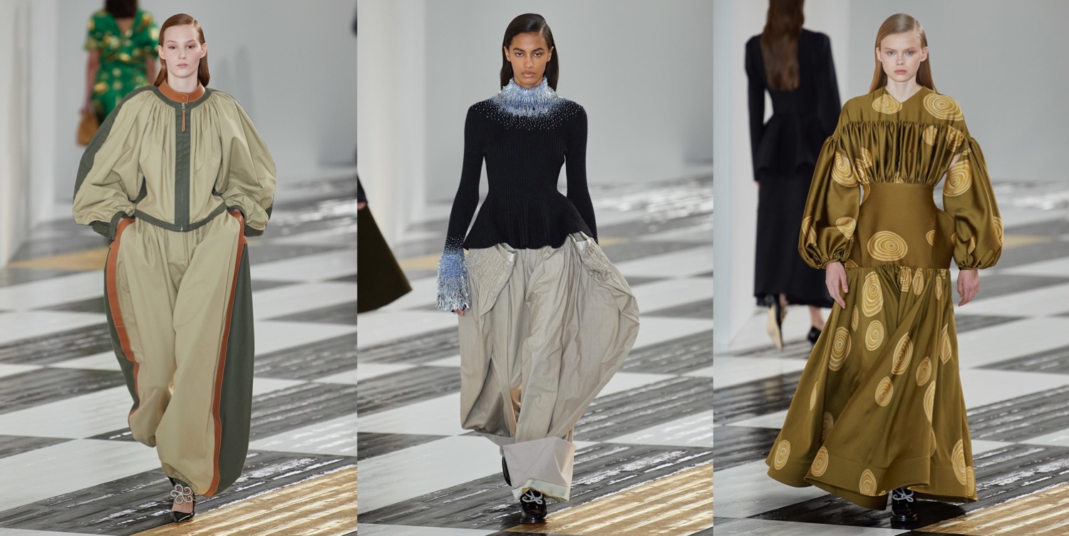 “Dressing to impress—I think that’s an exciting thing,” Jonathan Anderson declared backstage of his latest Loewe show. “Looking at building new types of silhouettes that can work in an abstract way. Trying to take a risk, maybe in my own self.” Taking risks is a trouble for many designers in Paris, so it’s great to see at least someone addressing that. What he began with – the volumized “entrance-making” shapes he showed in his JW Anderson collection in London – was followed through with inspirational conviction at Loewe. The collection at some points looked odd, but in a good, refreshing way. This line-up wasn’t obvious. What were these brocade dresses, gathered by Takuro Kuwata’s ceramic works? How to capture the shoulder-extending device from which caped-back sleeves were suspended? Anderson said he didn’t quite know exactly how he’d arrived at those ideas. “But sometimes it’s nice to feel vulnerable when you’re doing a collection – that you don’t know what the outcome is going to be before you start.” In pushing across the frontiers of the norm, Anderson relies partly on spontaneous curation. “Exaggerating by illusion” is one way he described the process. Yet the thing about Anderson is that his creative push is also part of his incredibly prescient long-term strategy to turn Loewe into what he’s called “a cultural brand” (he’s reconstructed it into a fashion home for the art-owning and gallery-going international clientele). This as well gets reflected in Jonathan’s fashion. Echoes of 17th century Spanish art – especially Zurburan and Velasquez – come in the subtle Spanish semiotics Anderson embeded in the collection. Maybe there was a hint of flamenco in the raw-edge tiers in a gray flannel coat and the triple-fluted sparkle-dusted sleeves of a ribbed-knit dress. But then, some of the dresses had volumes that made you think of medieval-wear we know from miniature illustrations.