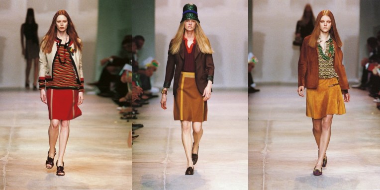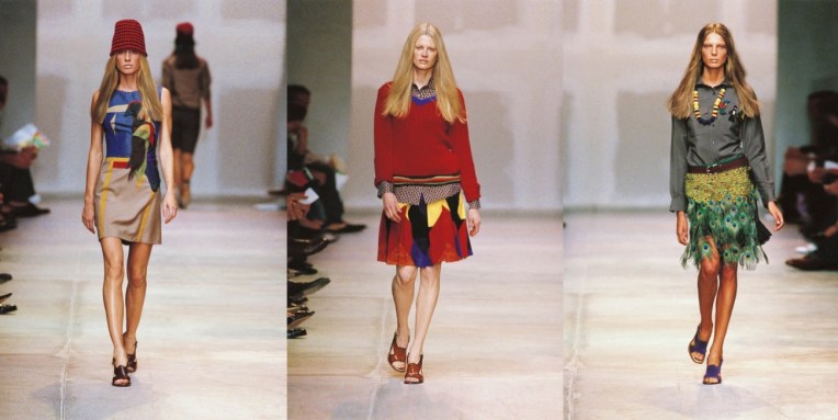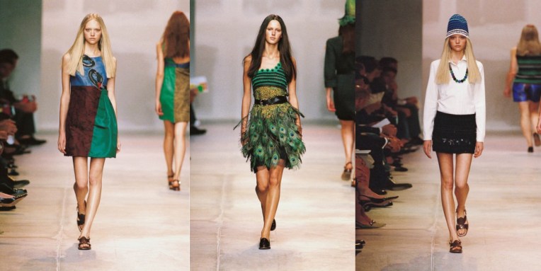 I’m always obsessed with a Prada collection. Sometimes, I’m completely absorbed in her take on bourgeoisie and conservative dressing. Another time, I drift away in her more surreal styles. But lately, Miuccia Prada‘s spring-summer 2005 keeps popping over and over again in my mind. It’s like a scent of summer holidays, which are the perfect balance of heavenly relax and active experience of discovering. Back in the day, Miuccia acknowledged that this collection was a leap from her more demanding line-ups. “A vague idea of birds; birds of vanity, like peacocks, parrots, and swans,” was a starting point in her restless search for change, she explained. “I also wanted to move toward something more young and sporty, tall and narrow.” To bring the audience into her new reality, Prada stripped her familiar clean, boxed-in stage set down to the bare industrial walls, then projected Rem Koolhaas’ mind-scrambling collage of live news images onto them. It was a lot to take in before the show even started – but that, one suspects, was exactly Prada’s intention with the clothes, as well. There was so much going on. A rhapsody of colour, an excess of textures. But also, a different silhouette (short hemlines, worn mostly with flat sandals), a return to one of her favorite palettes (brown-ochre-rust), and as always, lots of artful eccentricity, like peacock feathers (I saw this dress at Didier Ludot vintage store in Paris and its magnificent) and knitted flowerpot hats. There was also a Jamaican dance hall vibe, with reggae on the sound system, Rasta stripes in the knitwear, and Caribbean crochet in the raffia hats and cardigan coats. And, oh, please note how relevant it is! That’s the power of Prada.