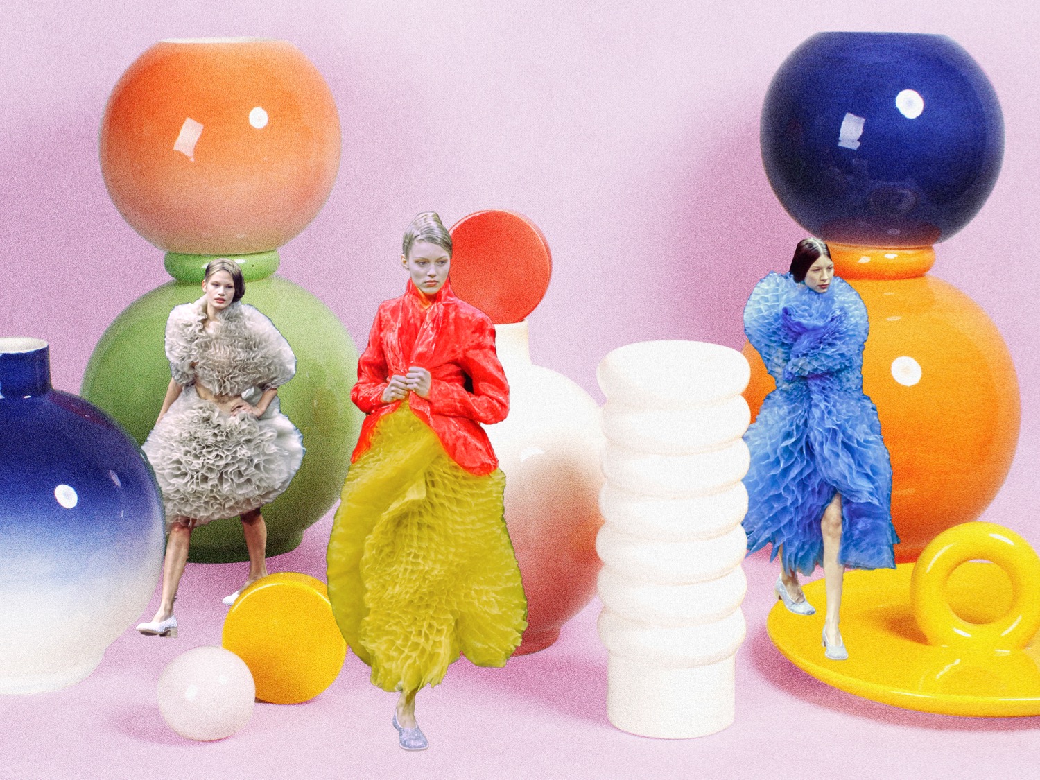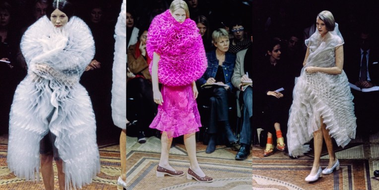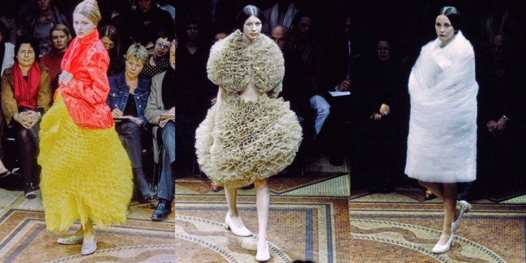 Pre-Instagram times, a collection worth thousands of posts (and unforgettable, eye-catchy content…). Back in 2000, Junya Watanabe presented one of his most ethereal collections ever. At first glance, the honeycomb ruffs Watanabe showed in his “Techno Couture” line-up called to mind those seen in Rembrandt portraits. Well, not exactly: those starched confections couldn’t fold and be stored in an envelope, like Watanabe’s ground-breaking designs. They certainly weren’t made of a “techno” fabric like polyester chiffon, from which the designer created his exaggerated take on the ruff, transforming it from an accessory to a garment with an organic-meets-space-age aesthetic. The material might have been unknown in Rembrandt’s time, but its method of production – hand sewing – certainly was. In the above collage, some of my favourites looks from the collection interact with Malwina Konopacka‘s “Forms” collection of ceramic tableware.